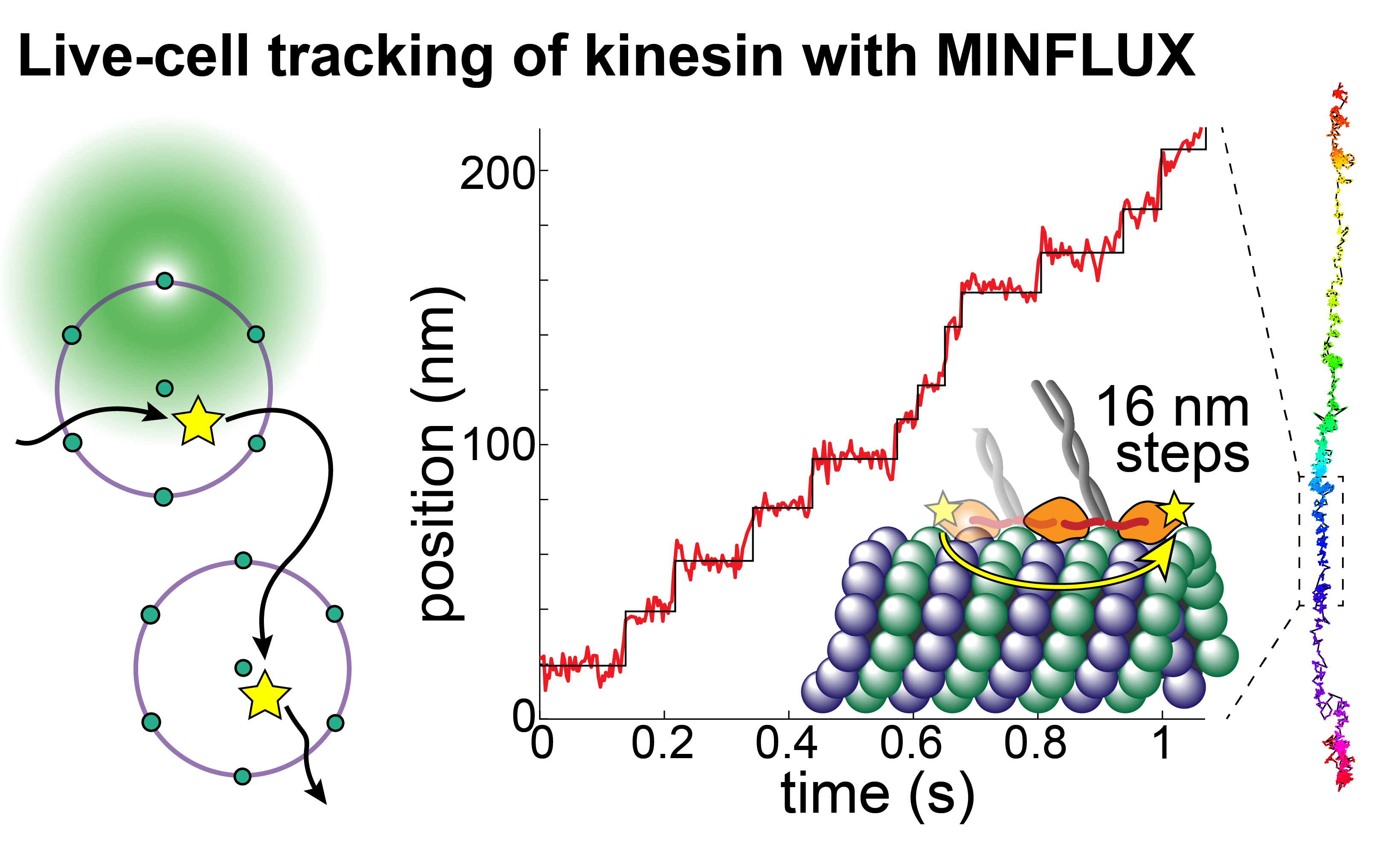 Using a commercial MINFLUX microscope, we established single particle tracking of motor proteins in live cells. We have successfully demonstrated that MINFLUX is capable of resolving nanoscale conformational dynamics of protein machines at nearly physiological conditions and were the first to directly observe the 16 nm steps of the kinesin-1 while it walks on microtubules in living cells. We have published one peer-reviewed scientific article and presented the results in four scientific conferences.
