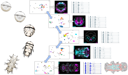 In this project we studied the early development of a marine worm in order to document how cell types emerge and understand the mechanisms that control cellular differentiation. We gathered snapshots of gene expression with single-cell resolution for various time points during development and tried to stitch them together. We intended to supplement this with data of different types that would provide more context, such as the location of the cell types in the body of the developing worm or the characteristic morphology of each cell type.