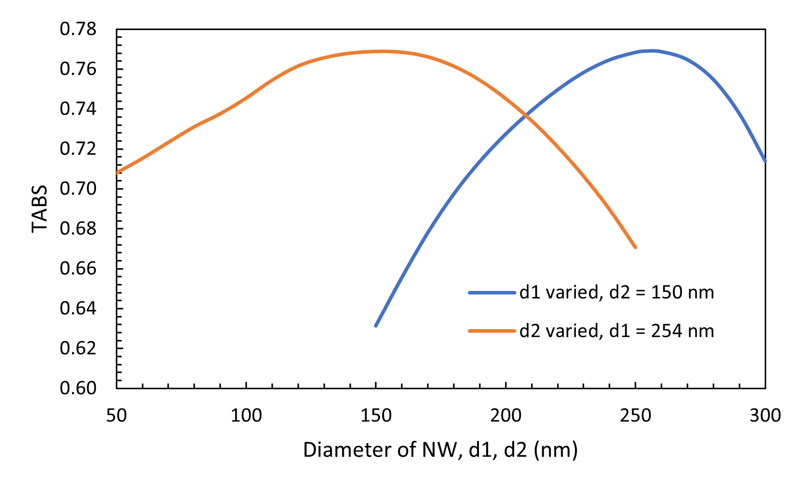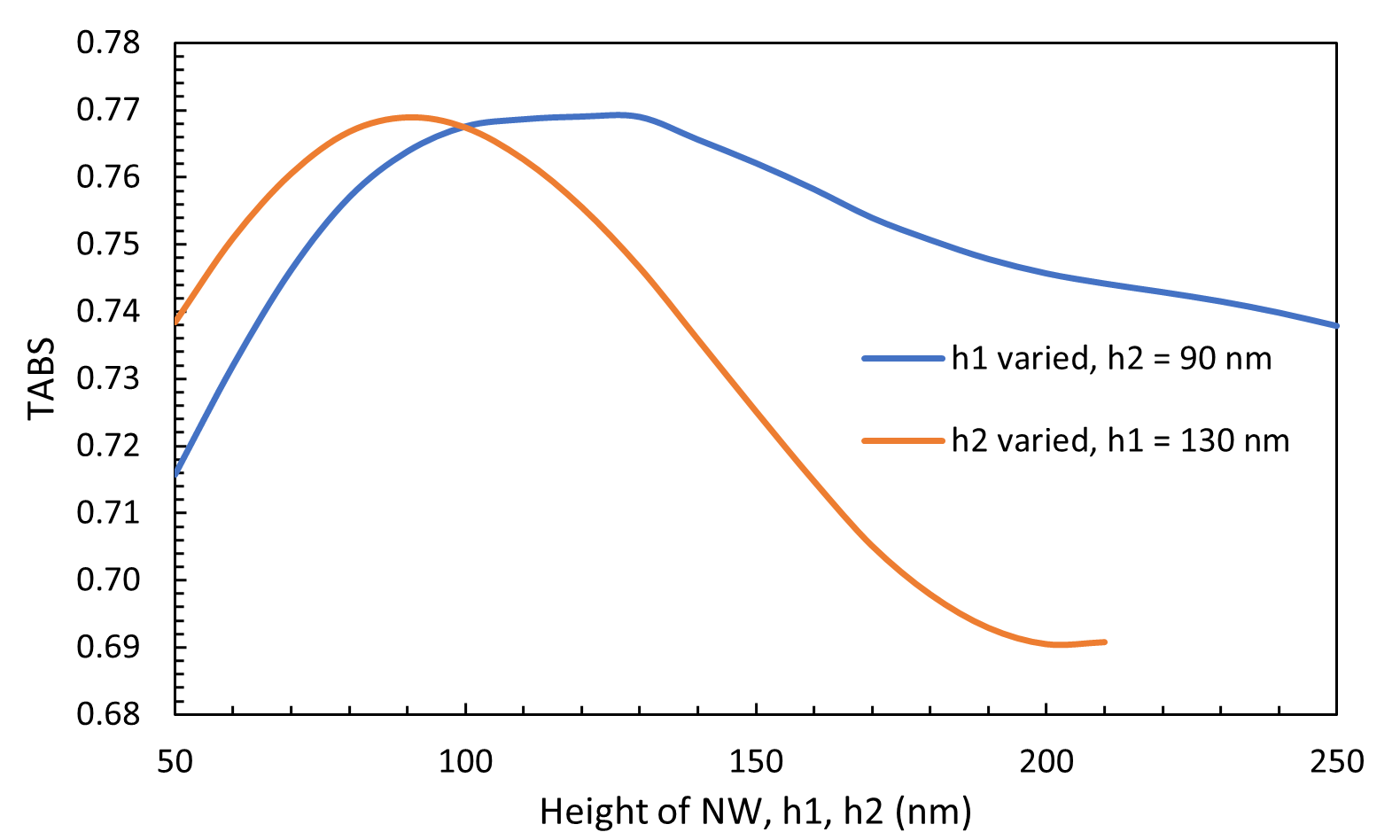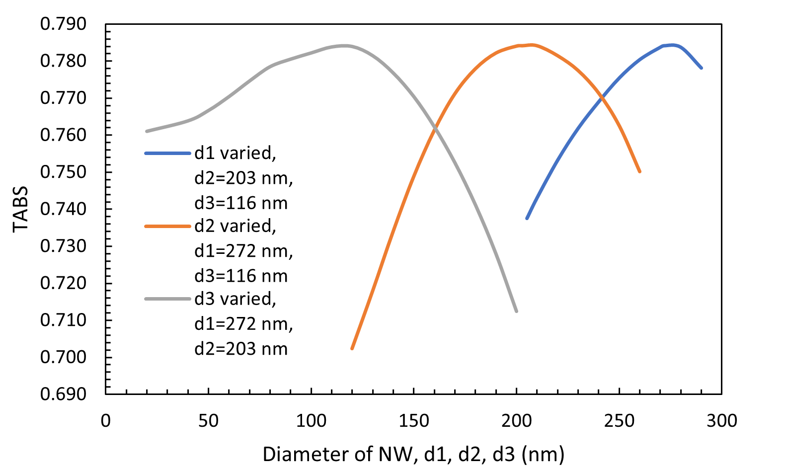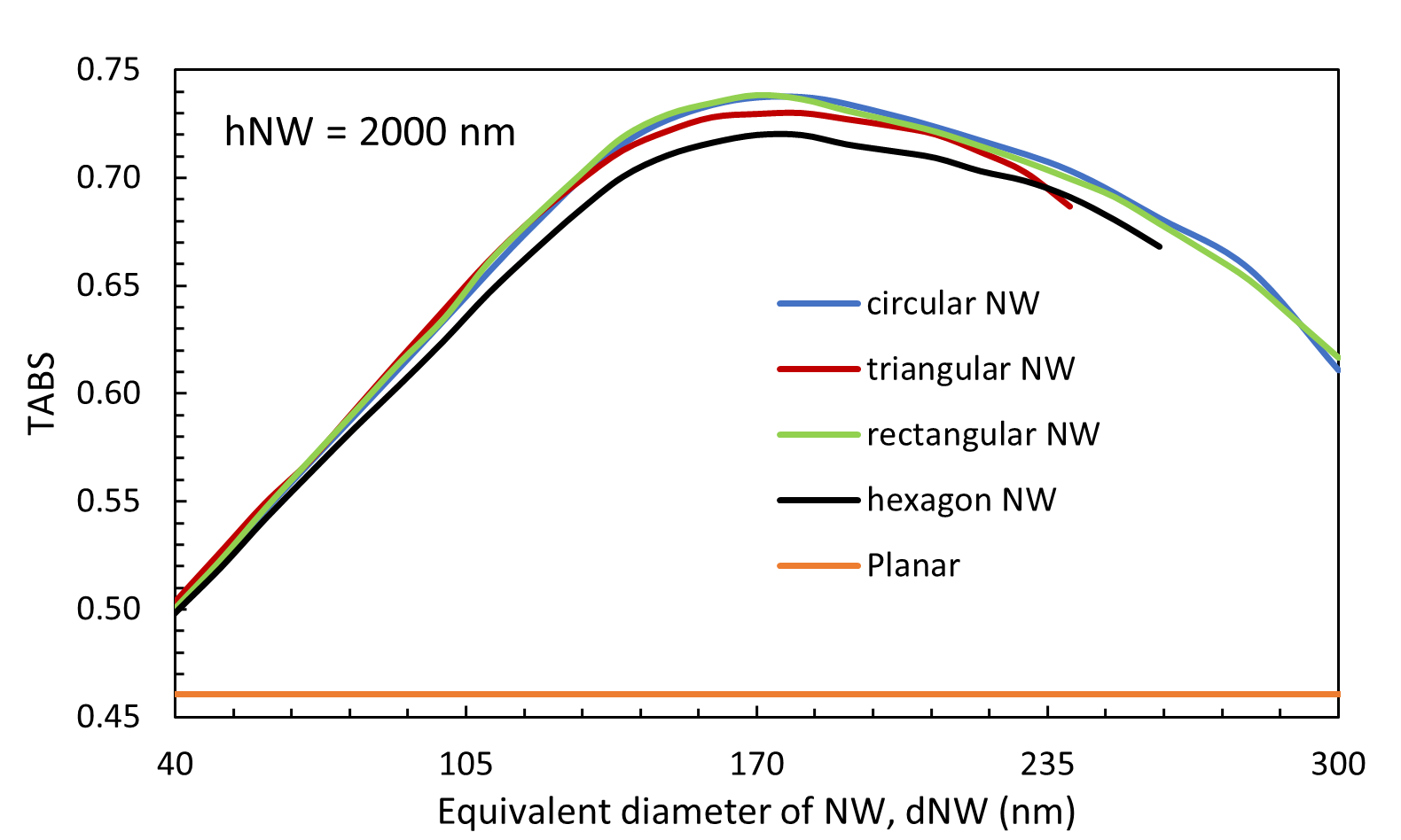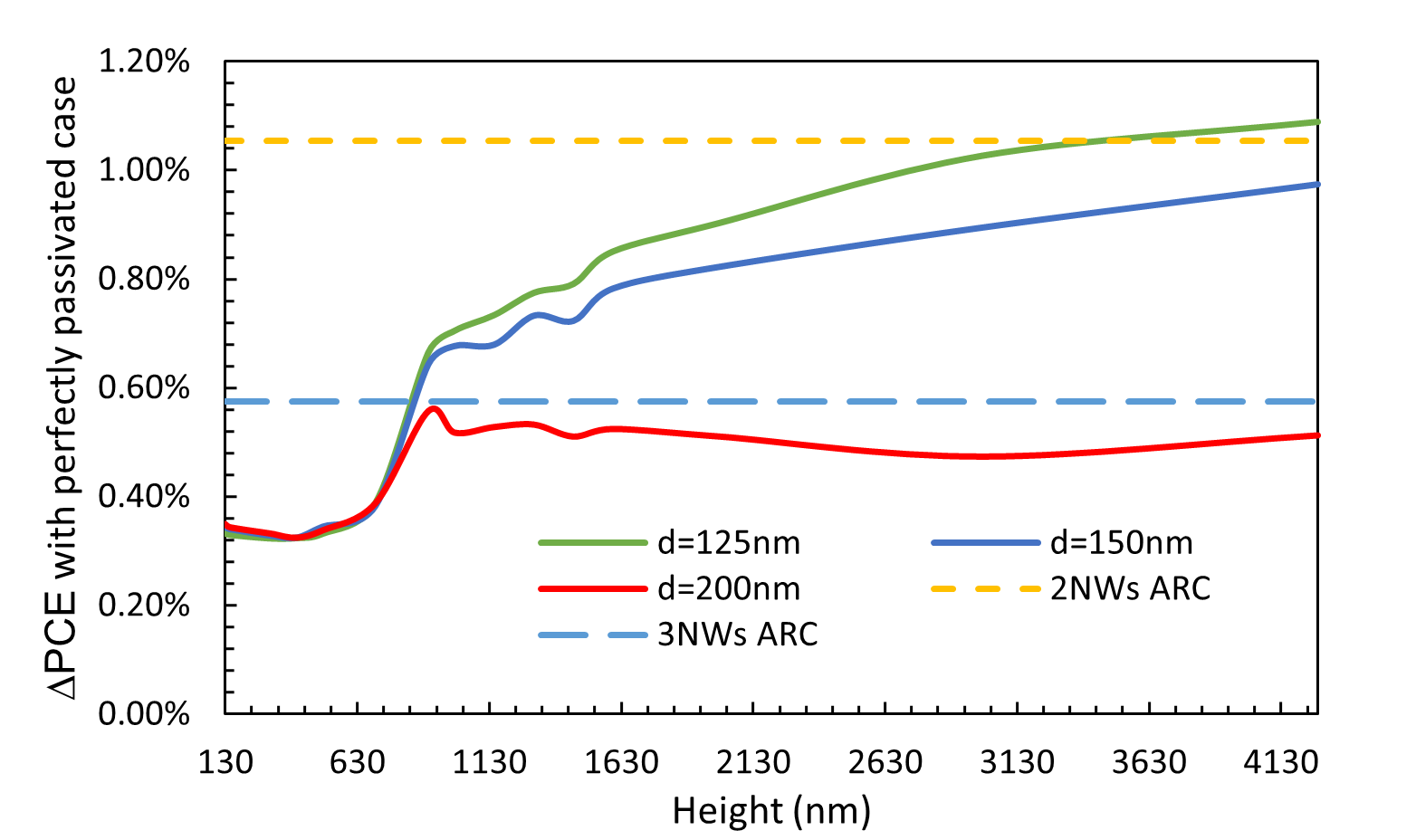 Nevertheless, with so many different patterns available, it is important to determine which pattern offers better performance. This is one of the questions that this project has been able to answer. We have also identified how the often-forgotten short NWs can be used to mimic the performance of Anti Reflection Coating layers. Then, following this logic, we have successfully mimic 2 and 3 layers ARC using NWs.