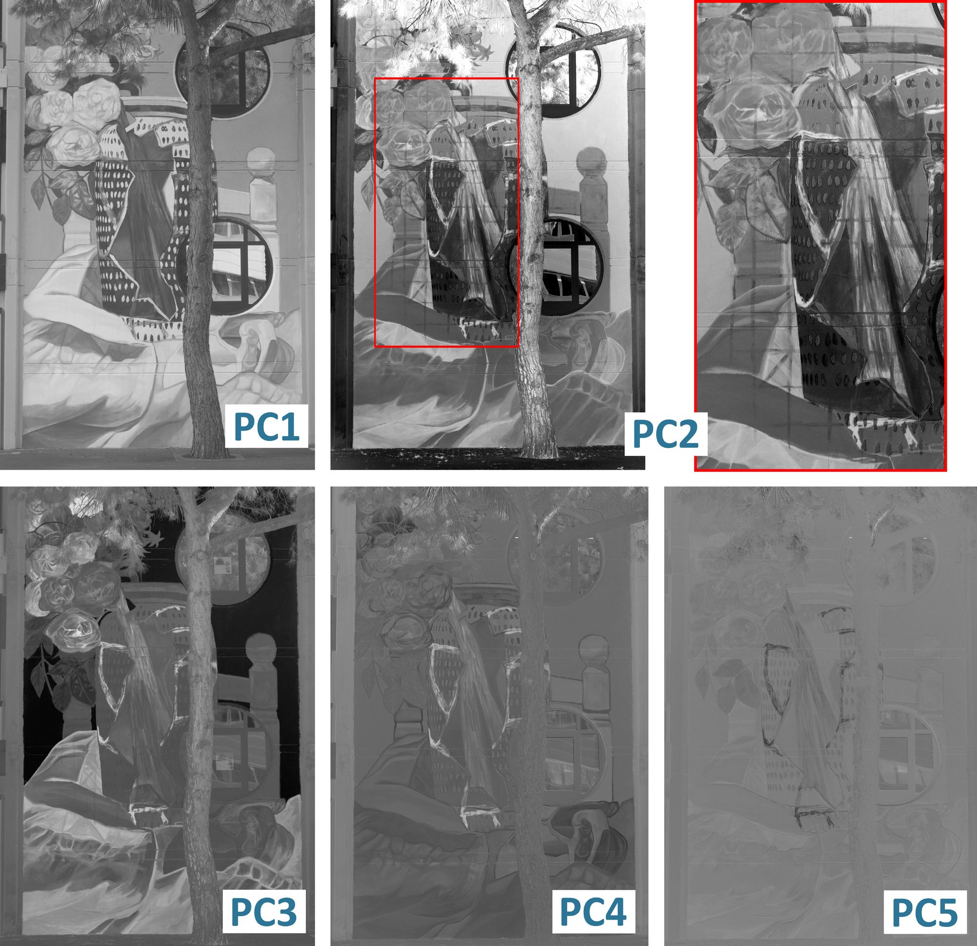 In addition, active MWIR thermography (approx. 3.000-5000nm) in lock-in and pulse-phase techniques will be used. The object will be excited thermally, and the material behaviour during the excitation and cooling is recorded and analysed. Due to the different thermal behaviour of pigments and materials, the technique allows tracing covered paintings hidden under the surface visible today.