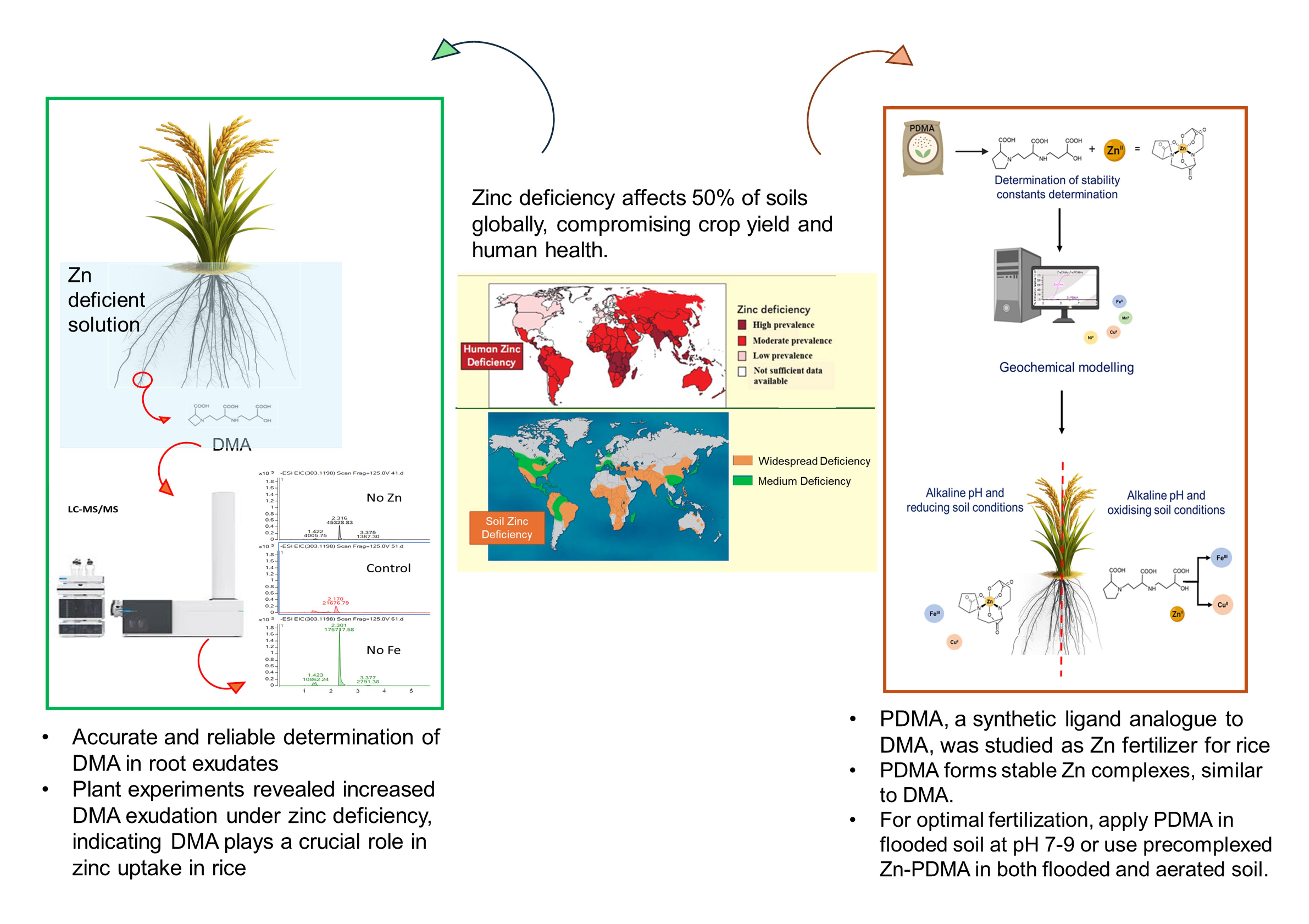 3) To investigate Zn-DMA interactions, proline-2′-deoxymugineic acid (PDMA), a synthetic ligand analogue to DMA produced by Aichi Steel Corporation, was used as a practical model compound. PDMA is chemically stable and more cost-effective to synthesize than natural DMA. Potentiometric titrations and thermodynamic speciation calculations show that PDMA forms stable complexes with Zn in soil solutions with pH from 6 to 9, showing similar behaviour to natural ligands like DMA. PDMA was then evaluated as a potential Zn fertilizer for paddy soils. Geochemical models showed that PDMA preferentially binds with Cu and Fe in oxidized conditions and with Zn in reduced conditions. The project identified optimal conditions to maximize PDMA efficacy. Considering paddy soil parameters (pH, redox potential, and salinity), PDMA should be applied in flooded soil at pH 7 - 9 or as complexed Zn-PDMA in flooded and aerated soil. This is a promising strategy to mitigate Zn deficiency in soil, enhancing rice nutrition and reducing human malnutrition. The collaboration with Aichi Steel helped us avoid the complex and costly synthesis of DMA and advance the application of synthetic, eco-friendly molecules inspired by natural ligands like DMA, to enhance Zn availability in agricultural soils.