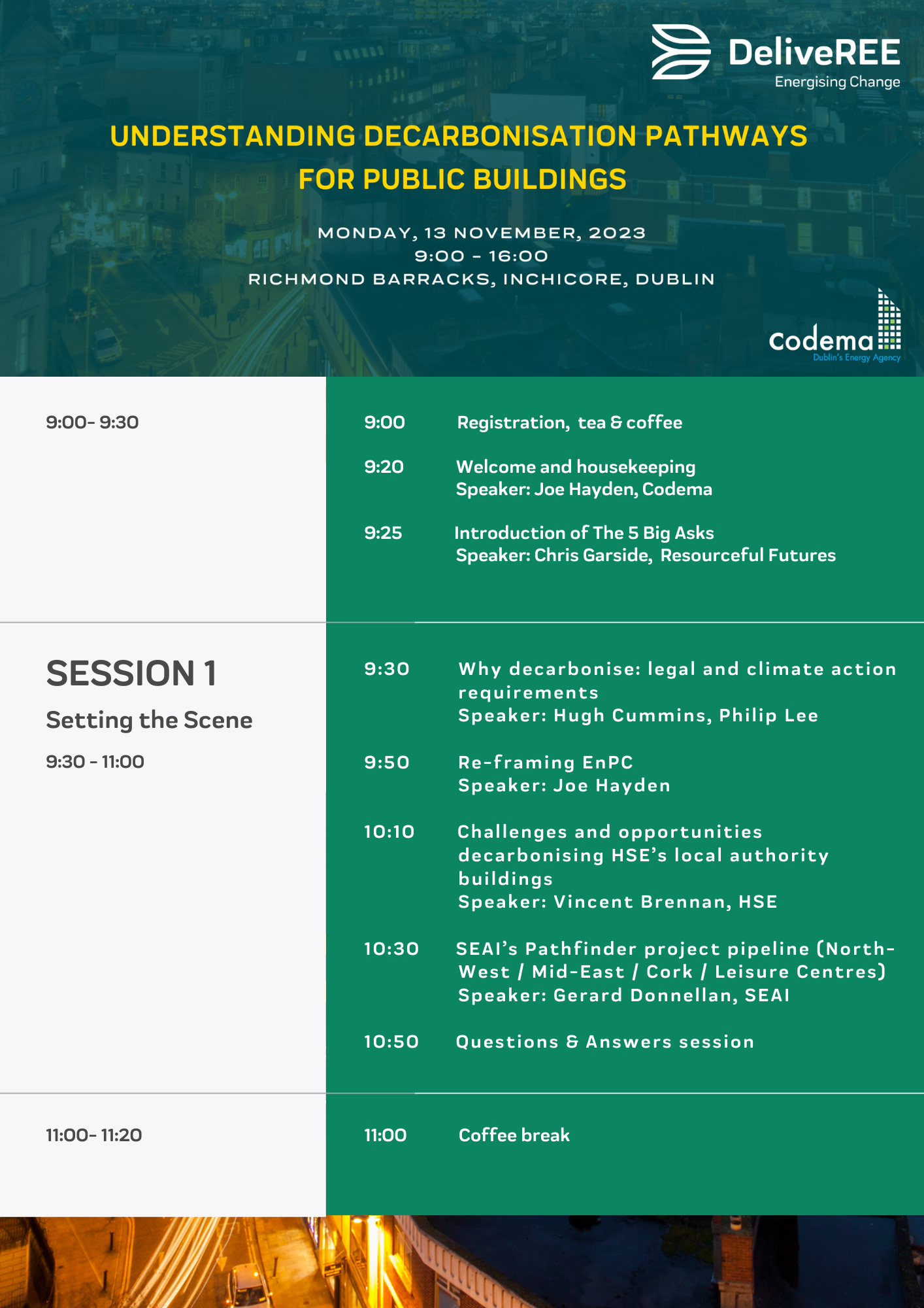 Codema, along with project partners, conducted dissemination activities to promote DeliveREE. This included workshops targeting senior management in Local Authorities and launching the DeliveREE hub on Codema's website and presentation at the Association of Energy Engineers’ Expo & Conference and efforts continued with platform development and workshop planning. In June 2023, a successful webinar on EPC benefits in Ireland attracted stakeholders' interest. The consortium addressed challenges like capacity building and procurement issues. A conference facilitated knowledge dissemination, and interviews provided insights for future project directions. DeliveREE's presence at events like the Covenant of Mayors Investment Forum Energy Efficiency Market Place helped disseminate findings. Codema promoted the CoBP through platforms like LinkedIn, fostering best practices exchange. These efforts raised DeliveREE awareness, engaged stakeholders, and promoted energy efficiency and decarbonisation practices.