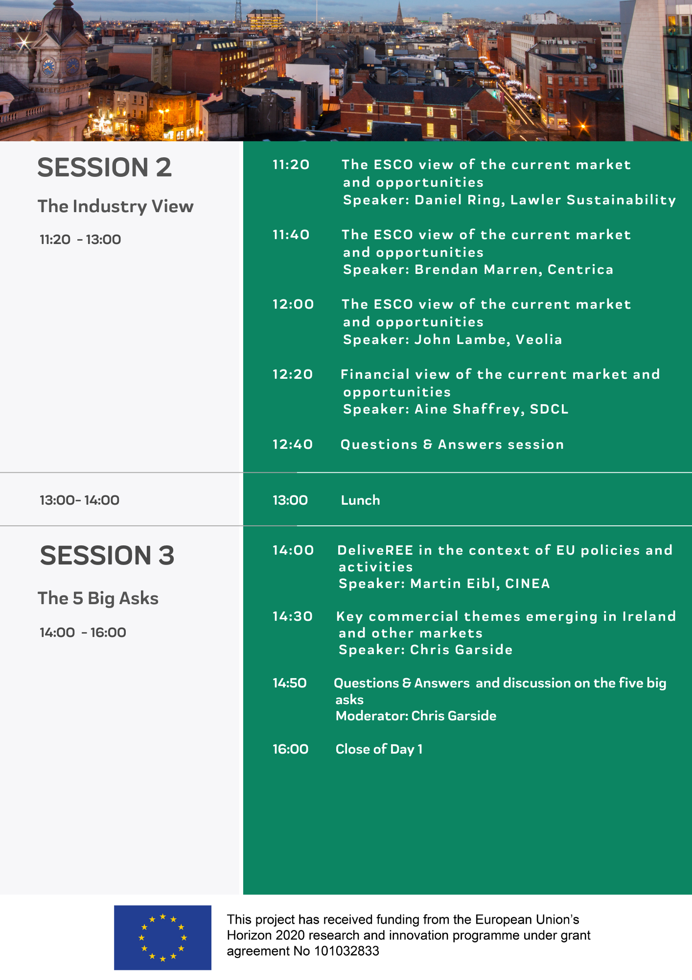 DeliveREE will pilot the PIU with over 140 EE projects in public sector buildings across the 4 Dublin Local Authorities. Expected energy savings are 24GWh and 3.8 ktCO2, with a total CapEx of €19.5m. The estimated contract value is €23.5m with €9.75m privately financed.
