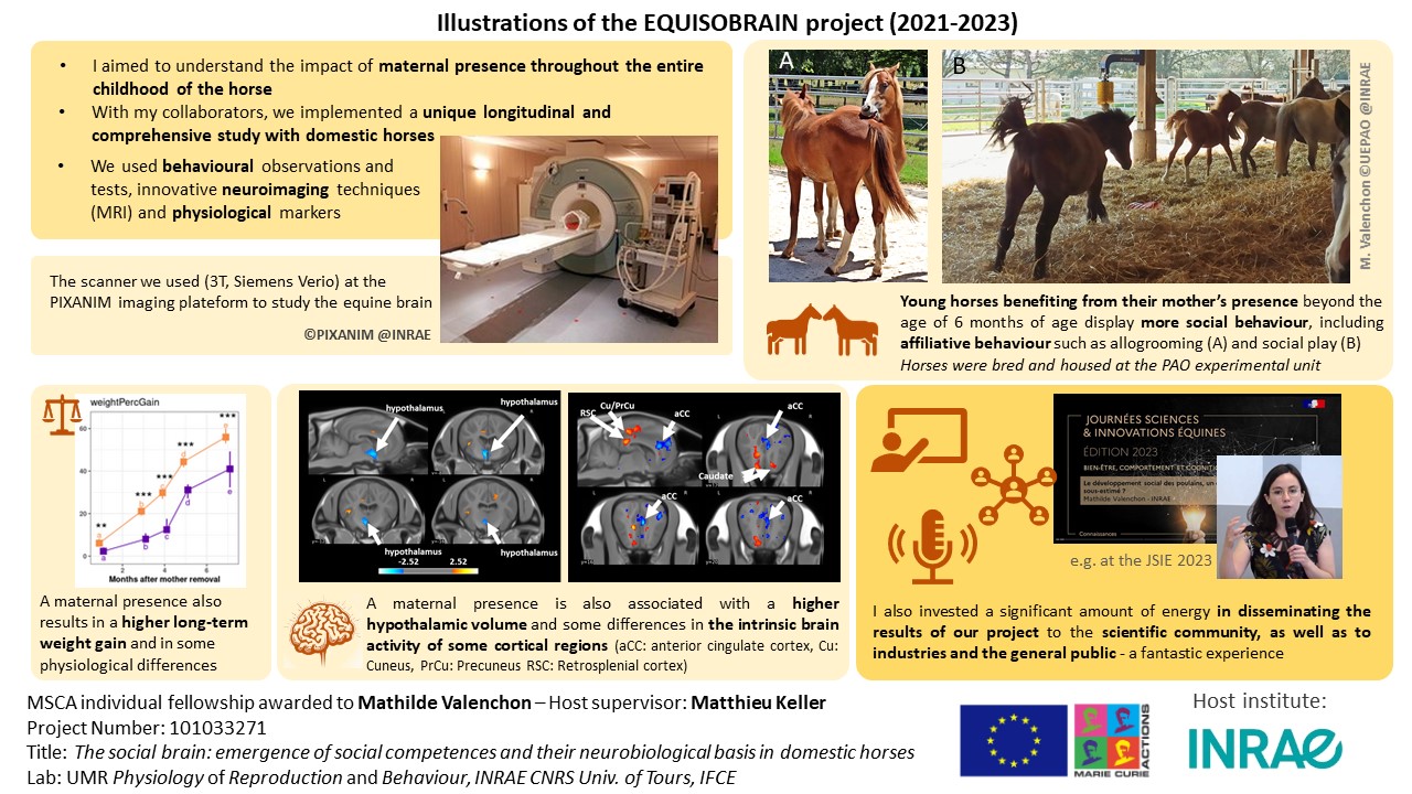 The overall objectives of the project were: 1/to investigate the influence of disruption during the socialization phase on the development of social competences and related neural substrates in domestic horses, and 2/ to explore the broader implications of prolonged maternal presence on animal welfare and development. The project utilized a holistic longitudinal approach, combining behavioural and experimental assessments with non-invasive neuroimaging techniques (MRI, rs-fMRI, and diffusion MRI).