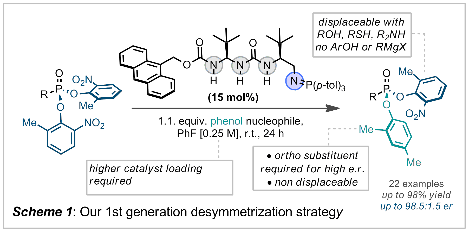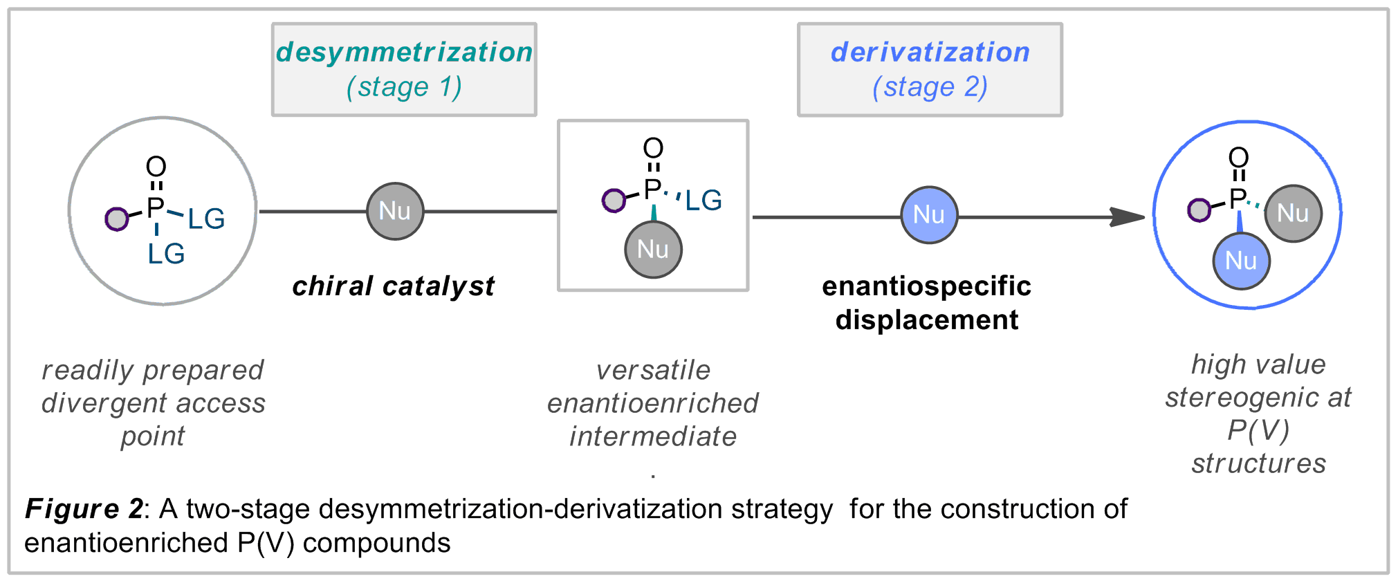 Compounds containing one or more phosphorous atoms in the P(V) oxidation state are important to chemistry, biology and medicine. These include marketed antiviral drugs such as Remdesivir, and Sofosbuvir; the former garnering interest as a potential treatment for COVID-19, and the latter being on the WHO list of essential medicines for the treatment of Hepatitis C (Figure 1). Accordingly, new and improved methods for the efficient synthesis of P(V) containing compounds, especially in an enantioselective fashion are essential. Although promising protocols are beginning to arise for the synthesis of racemic P(V) compounds, new strategic approaches for the stereoselective synthesis of P-stereogenic centers are limited and catalytic enantioselective approaches remain largely unknown. Despite these advances, direct enantioselective catalytic desymmetrization protocols involving reactivity directly at the P(V) remains unexplored. We envisioned a two-stage desymmetrization–derivatization strategy (Figure 2) by which enantiotopic phenolic leaving groups on a prochiral phosphonate ester are enantiodiscriminated by a suitable nucleophile under the control of a chiral catalyst, generating a new P−O bond. The resulting intermediate would retain suitable reactivity for sequential substitution of the remaining leaving group. With appropriate stereocontrol, this approach would overcome the key restrictions of previously developed protocols. Given the tunability and high basicity of our bifunctional iminophosphorane catalysts (BIMP), we expected that they would provide sufficient activation and could be suitably adapted to obtain high levels of enantiopurity in the products. Objectives: Therefore, the overall objectives of this project can be summarized as follows: a) To develop and explore the scope of the catalytic enantioselective nucleophilic desymmetrization reaction at P(V) with phenol pronucleophiles, including downstream derivatizations. b) To develop and explore the 2nd generation desymmetrization platform using thiazolidinone leaving group and application to a wide range of P(V) derivatives. Conclusion: In conclusion, a two-stage strategy for the synthesis of stereogenic P(V) compounds through an unprecedented enantioselective nucleophilic desymmetrization and subsequent enantiospecific derivatization, was developed (Scheme 1). A BIMP catalyst provided a unique chiral environment and sufficient pronucleophile/substrate activation to allow the desymmetrization to proceed with excellent yield and enantioselectivity. Through judicious choice of leaving group, facile downstream diversification of the desymmetrized P(V) ester with very high enantiospecificity was allowed. A 2nd generation enantioselective desymmetrisation at P(V) was developed (Scheme 2). Through the synergistic use of thiazolidinone leaving groups on P and fine tuning of the BIMP catalyst numerous drawbacks of previously established methods have been overcome. Now, phenols with a wide array of substitution patterns can be readily employed as nucleophiles in the desymmetrisation step with both aryl and alkyl derived P(V) electrophiles as substrates. The resulting enantioenriched intermediates could be converted to an even greater range of distinct classes P(V) of compounds.