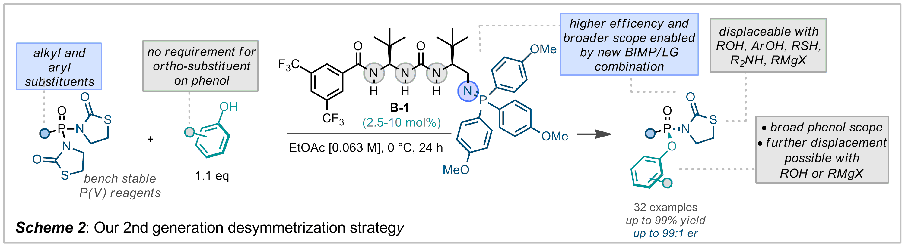 To explore the proposed reaction design, we began our investigations by identifying an appropriate model system, utilizing 2,4-dimethylphenol as the nucleophile and a BIMP superbase catalyst. After a comprehensive investigation of potential leaving groups, 2-methyl-6-nitrophenol gave optimal enantioselectivity (97:3 e.r.) albeit with a drop in reactivity. By conducting the reaction at room temperature in fluorobenzene and fine-tuning the basicity of the catalyst, the yield of the desymmetrized product was increased to 84% and its e.r. was found to be 96:4. With the optimized conditions in hand, we proceeded to explore the scope of this transformation. We were pleased to find that a variety of phenols possessing ortho-substituents were well tolerated and high yields and enantioselectivities were maintained. Bulky, naturally occurring phenols totarol and thymol were also competent nucleophiles. Nucleophiles bearing no ortho-substituent were found to afford the corresponding products in good yields but poor enantioselectivity. Next, we proceeded to vary the P-linked carbon substituent on the phosphonate ester electrophile. Such changes were broadly tolerated with aryl, methyl, higher alkyl and β-branched substituents maintaining high reaction efficiency and enantioselectivities. The reaction was also successful on a gram scale with no loss in yield or enantioselectivity. Having established the scope of the desymmetrization for both the nucleophilic and electrophilic components, we proceeded to assess the crucial 2nd stage of the strategy: the enantiospecific nucleophilic substitution of the remaining leaving group. We found that Lewis acid activation of the P(V) species, was highly efficient in promoting the second nucleophilic displacement. All four DNA nucleosides, hepatitis C treatment sofosbuvir analog as well as acetal-protected uridine and adenosine were successfully phosphorylated at the 5′-OH with moderate to good yields and >95:5 d.r. However, when using n-propanethiol as the nucleophile a different reaction conditions had to be used in order to access desired enantioenriched thiophosphonate ester. We then turned our attention to N-centred nucleophiles and were thrilled to find that when using N-Boc benzylamine as the nucleophile we could obtain phosphonamidite ester in 84% yield and 100% e.s. Cognizant of the strengths and limitations of our 1st generation strategy, the need for an improved 2nd generation method became clear. To achieve this, a full re-optimization of our 1st generation method was required. After an extensive evaluation of new leaving groups and BIMP catalysts, the use of thiazolidinone as a leaving group was found to be optimal. To our delight, our 2nd generation protocol could be carried out on a gram scale employing just 2.5 mol% of catalyst. Finally, the remaining leaving group can be readily displaced by medicinally relevant alkyl and aryl alcohols, amines, Grignards and thiols, providing divergent access to a wide range of enantioenriched P(V) species.
