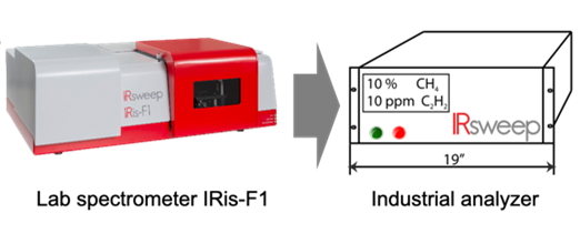 Subsequently, feasibility was shown in work package 2, where measurements of gas phase hydrocarbons were taken to demonstrate the applicability of QCL dual-comb spectroscopy for measurement tasks of process analytical relevance. In the experimental setup, the beam from the IRis-Core emitter unit was directed into an IRcell-S4 multi-pass gas cell. The multi-pass cell increases the effective pathlength of the beam through the sample gas to 4 m while maintaining a small footprint and gas volume of only 31 ml. The pressure in the gas cell was reduced to 100 mbar to narrow down the absorption features of the gases. Results were analyzed in a multivariate fitting method.
