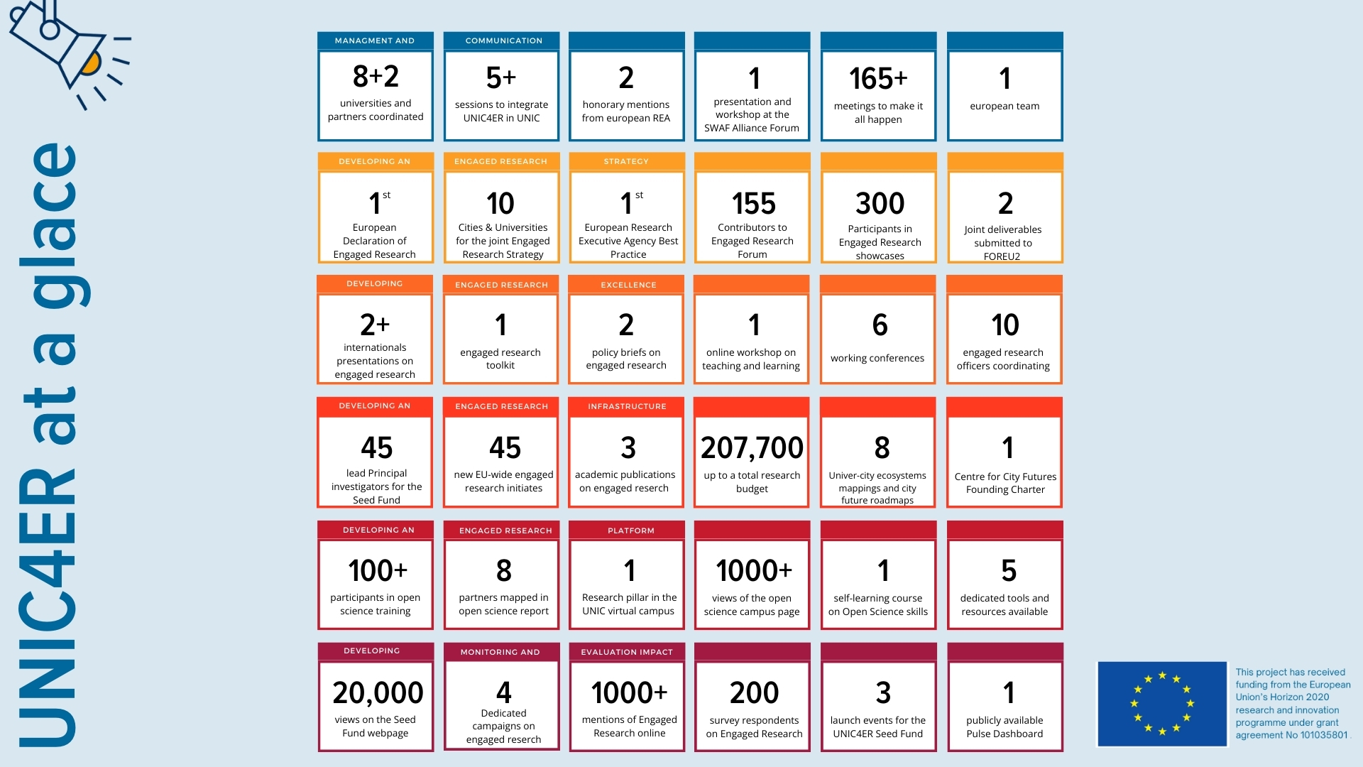WP1 is defined by its co-creation approach to improving communication and dissemination efforts. Ad hoc workshops were held to build team cohesion and reinforce the long-term vision of UNIC4ER, ensuring all partners feel included and part of the project's success. Tools and resources were distributed across all partners, with outreach efforts extending to external events. A framework for exploring future activities within the broader UNIC project was established, supporting continuous development. Joint alliance events were hosted, and collaborative efforts on deliverables were conducted together with all SWAF alliances. A total of 52 projects were disseminated through the UNIC website, generating over 20,000 views and inspiring further research. In addition, three European events were held to celebrate and promote the engaged research initiative.