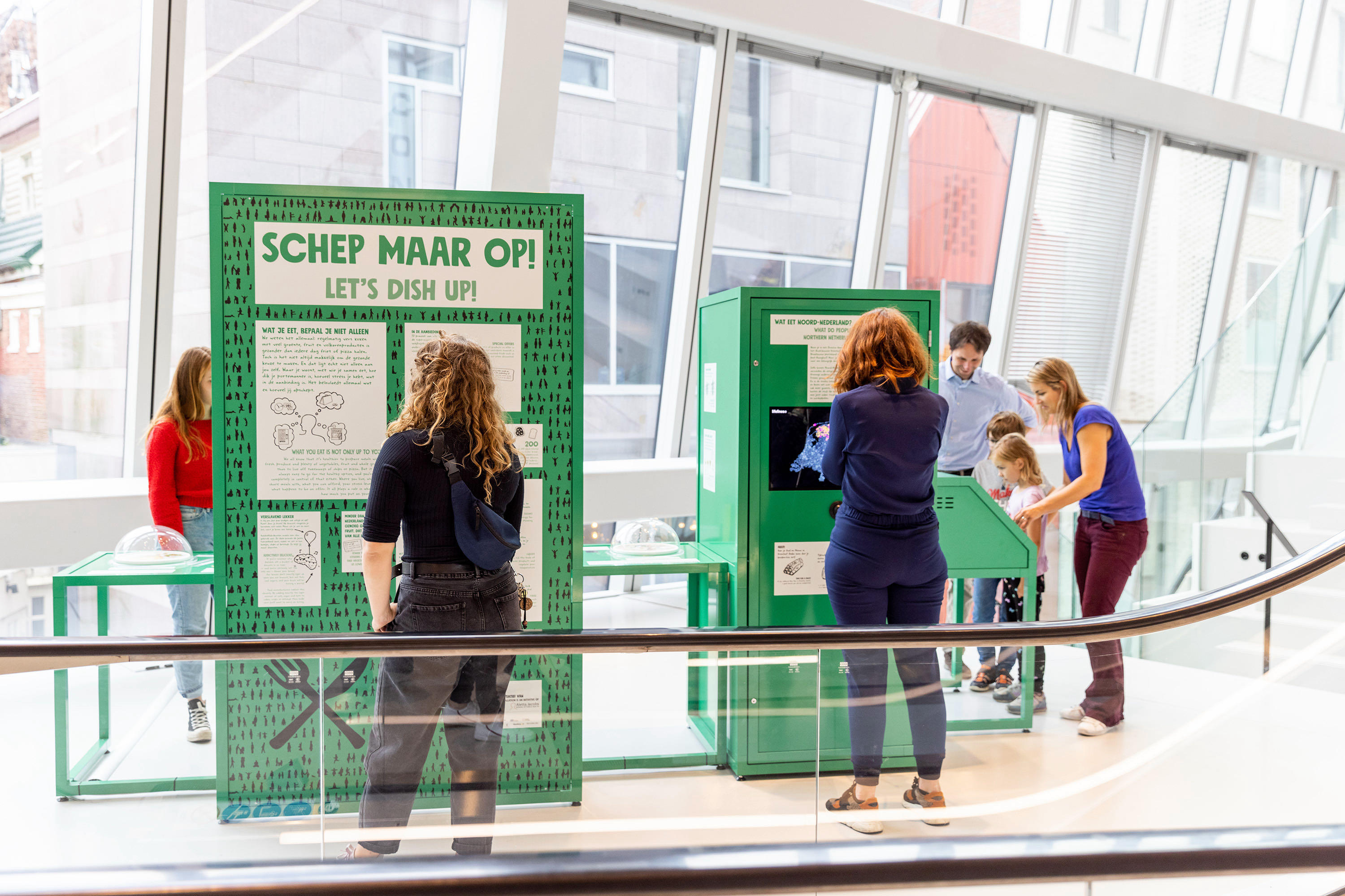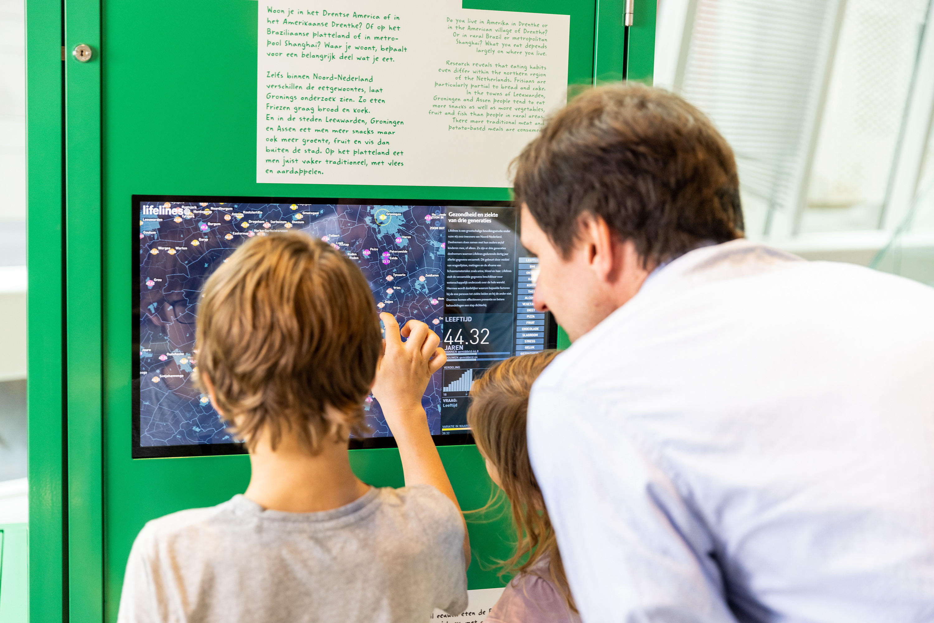 Interactive exhibit – An interactive installation was developed by scientists, students, an exhibit designer and the target group. The exhibit existed of a title panel, a fast super market game, a video, an interactive map of food habits in the region, a set table with food from past, present and future and a snack wall with views on sugar tax. It was in a very public spot in the Forum Groningen for two weeks, where many people of different ages and background interacted with it. By observing 337 of those visitors, it was seen that visitors spent 5 to 15 minutes interacting with the exhibit, all in their own way, and they found the exhibit innovative, interesting and fun. The exhibit is designed to travel to all corners of the region and beyond, to reach as many people as we can, especially those who do not usually interact with science. After the project FoodIQ the exhibit has been in five schools, a health centre and a library and is still travelling to some big national festivals, small local festivals, schools, libraries, community centres and more.
