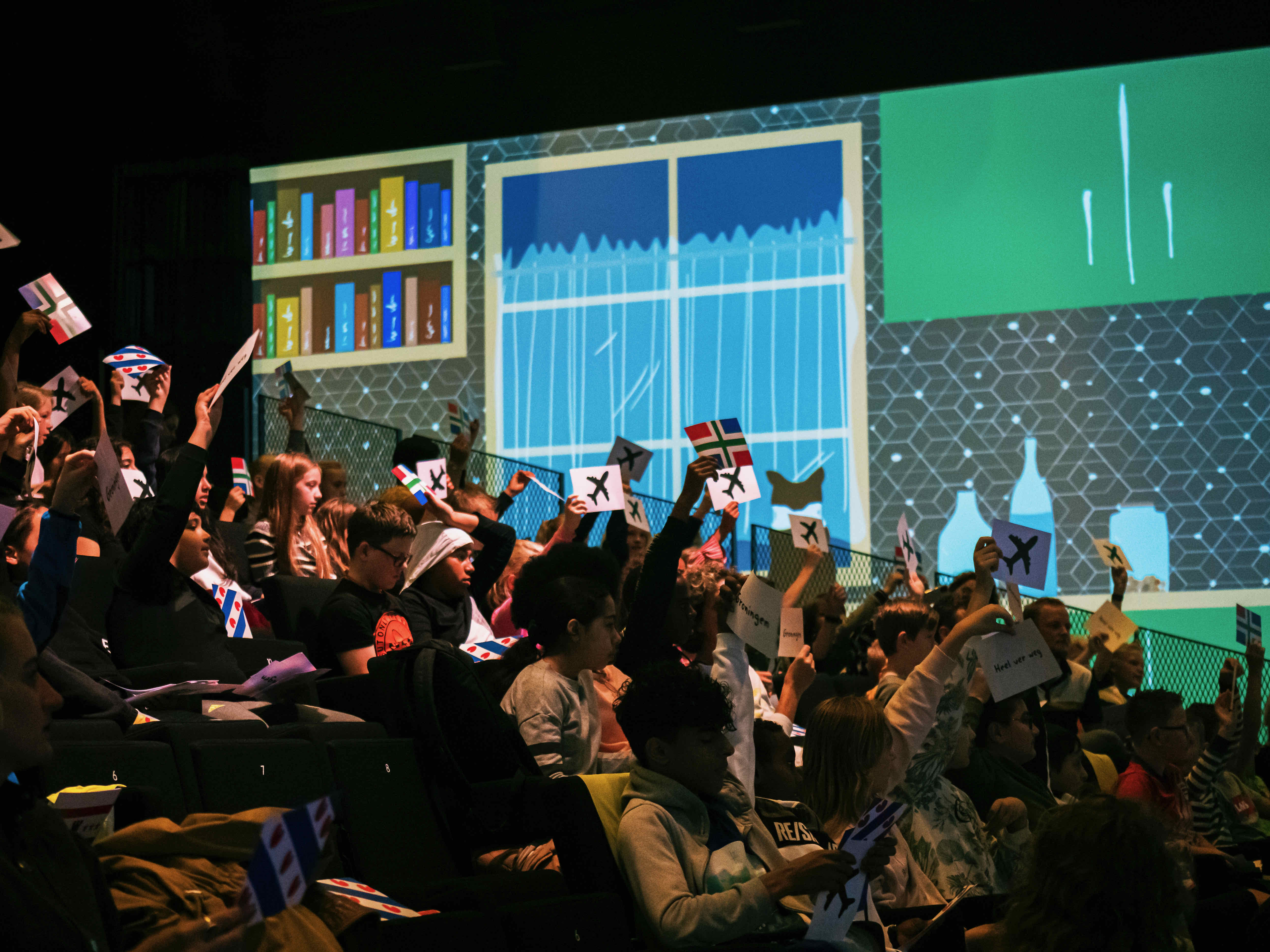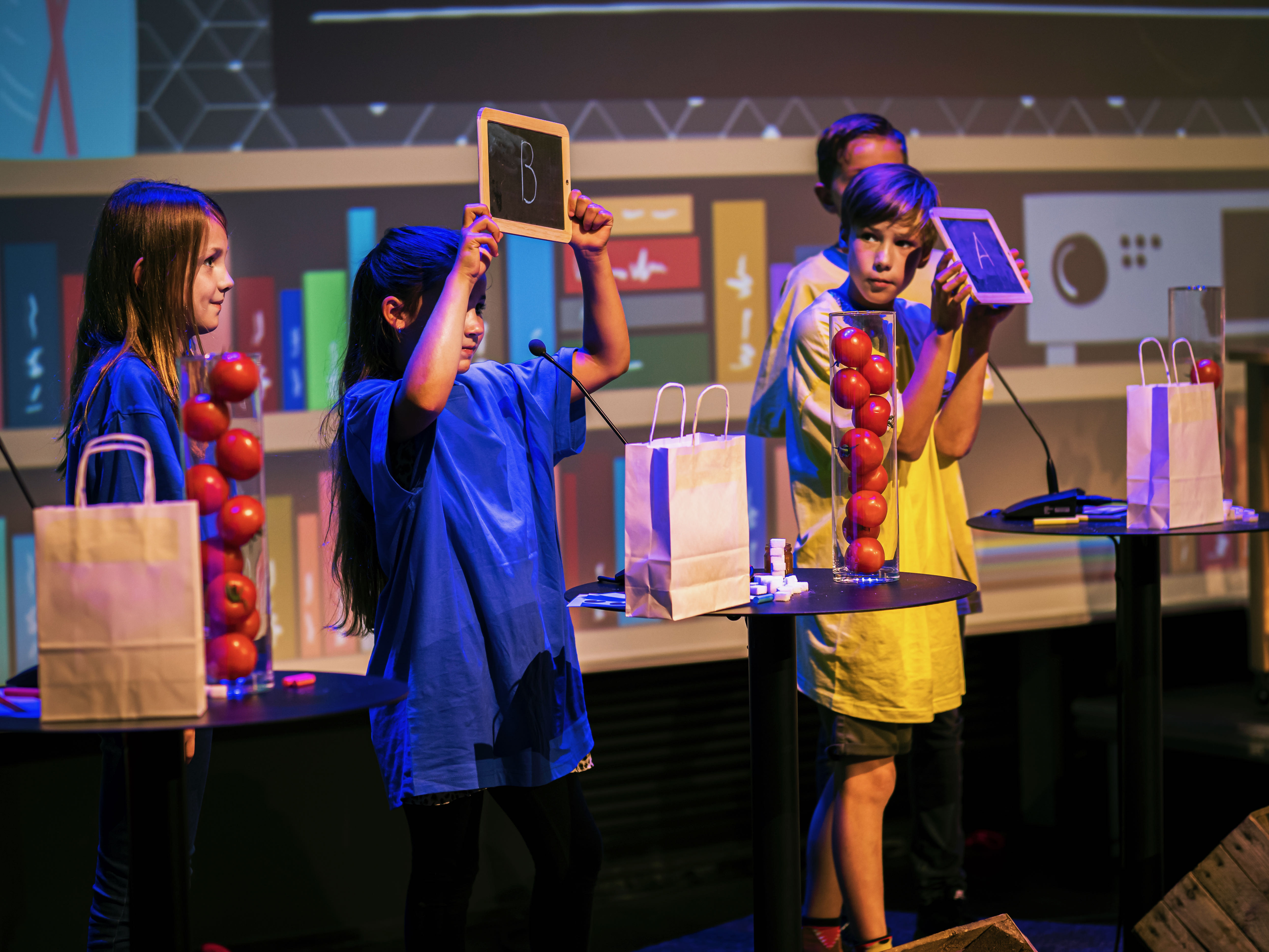The morning show (10:00 - 11:00) was a very lively quiz for an audience of 100 children from 7-12 and was also live streamed in about 40 classes. School teams from Reitdiep, Paddepoel, and Zuidhorn had the opportunity to get involved in science on food and interact with the scientists. The teams' classmates in the audience were supporting and advising the teams present on the stage.