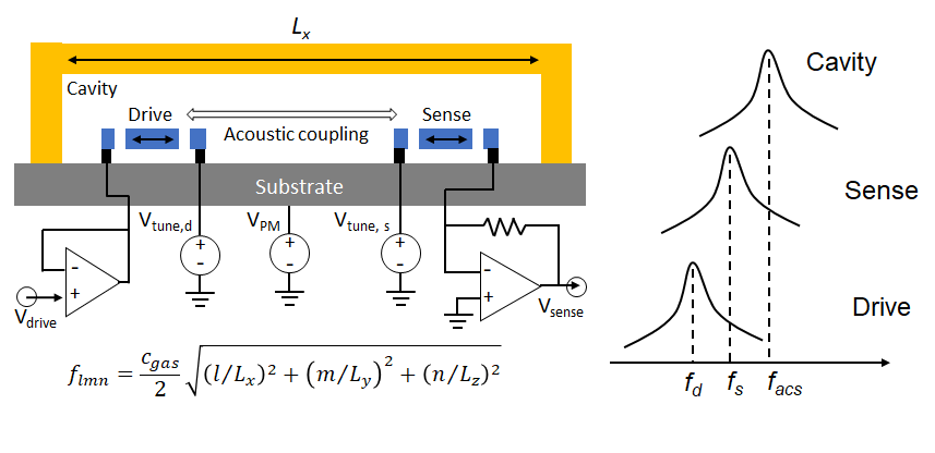 3. Characterization of the Gas Sensors: The fabricated devices were paired with electronics on a PCB for characterization. The devices were tested with and without the acoustic cavity to demonstrate the proof of concept. The acoustic resonance is excited by the drive resonator and the acoustic response is detected by the sense resonator. The test setup was automated to record the sense response while systematically sweeping the drive and sense frequencies. Acoustic coupling was not detected without the acoustic cavity on the MEMS die. A strong sense response was observed with the acoustic cavity when the MEMS drive and sense resonator frequencies match the cavity acoustic frequency. The cavity frequency response showing the acoustic damping was also extracted through the systematic frequency sweeps. The project successfully demonstrated the proof of concept for acoustic gas sensing. Two in-plane MEMS resonators can be coupled through the acoustic resonance of the cavity, the coupling and the acoustic damping could be used as a gas sensor.