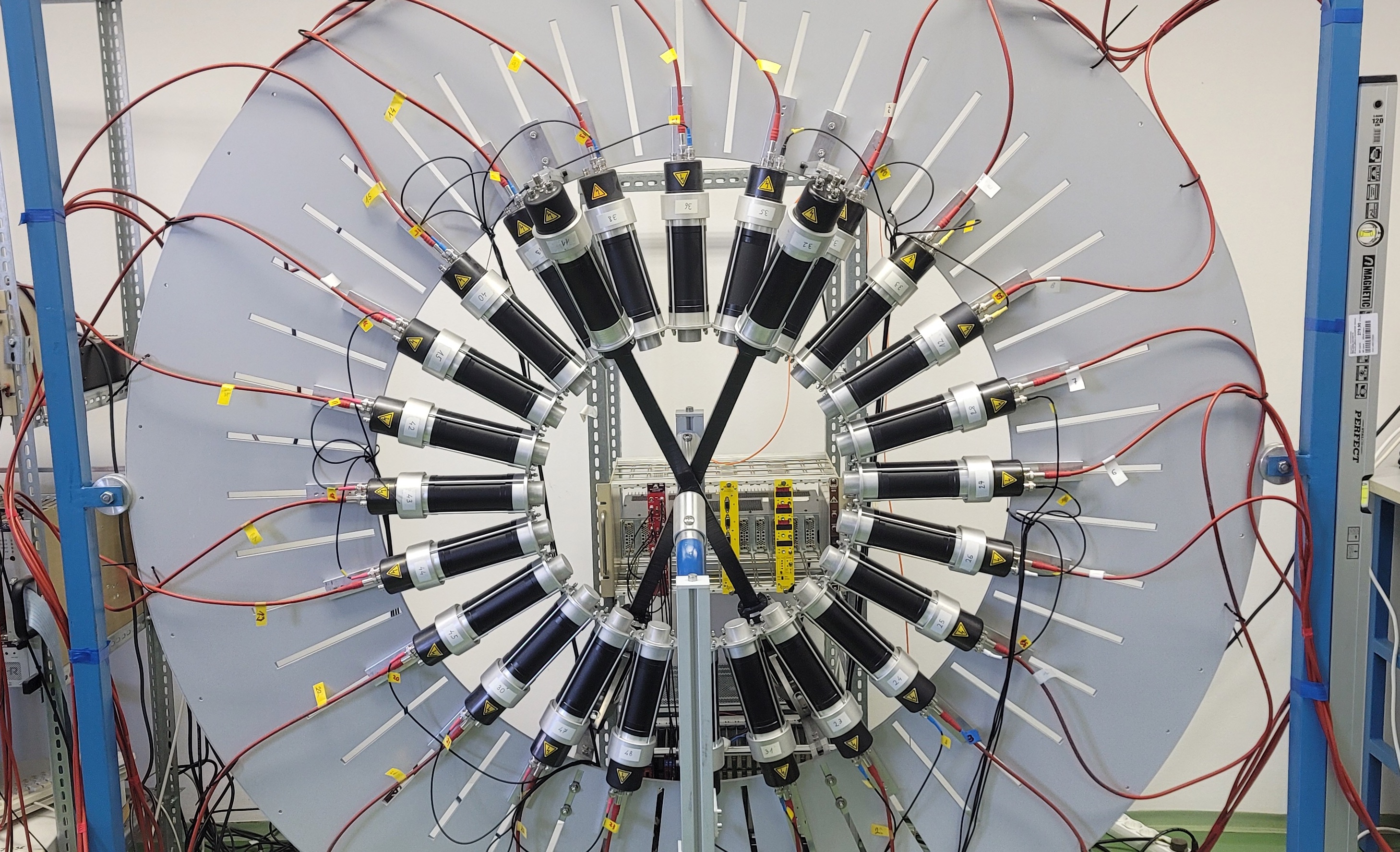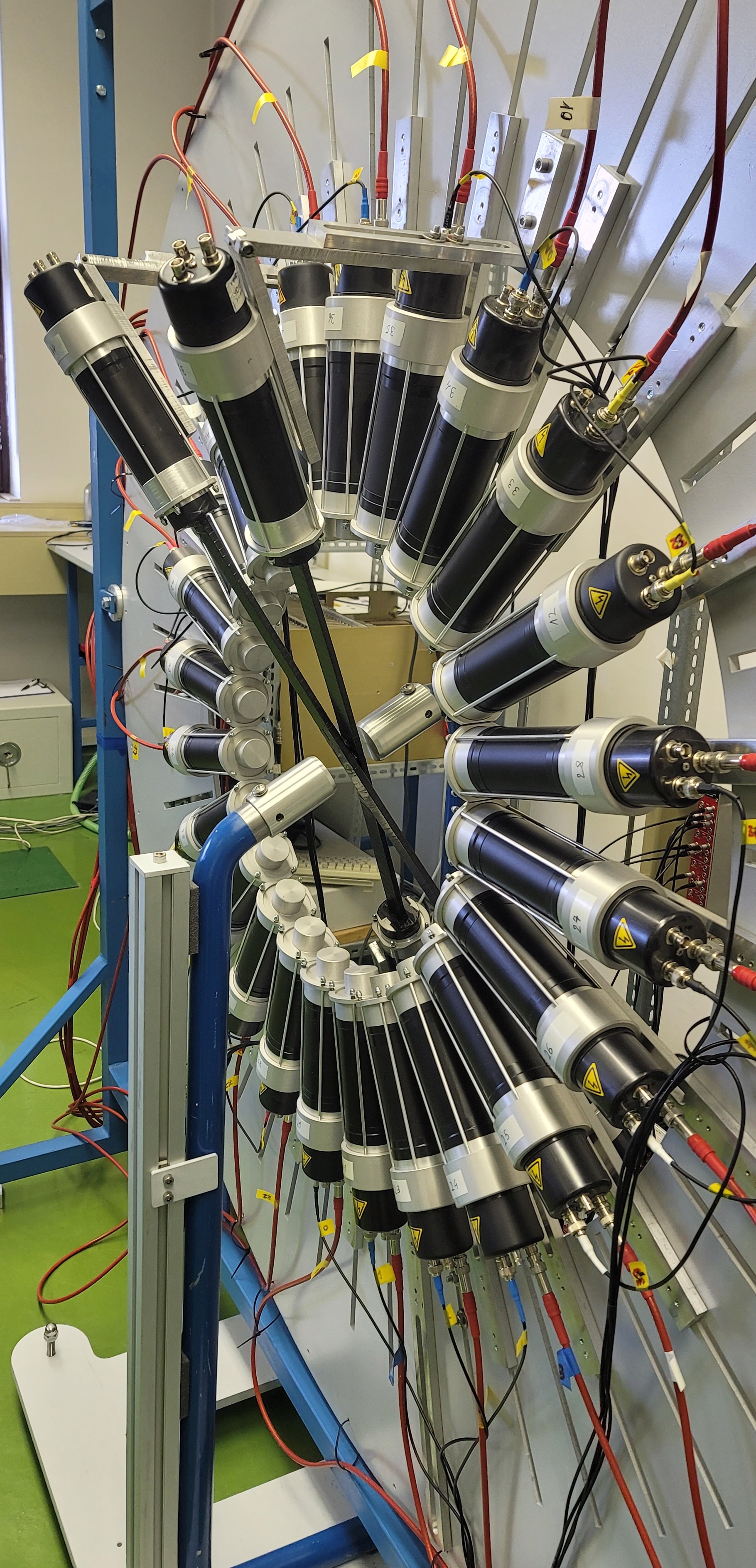 Since the positron tagging detectors are based on the 0.1 mm plastic scintillators the light yield out of these detectors is small. Several assembly methods and wrapping with aluminum foil were tried out to have the light signals at both ends of the light guide, which allowed for reading them out in coincidence and in turn reduce the background. The data acquisition program was optimized and tested with different data file types. Several test measurements with the completed experimental set-up where performed. The programs for data analysis based on ROOT framework were developed. Geant4 simulation for the study of the background was developed.
