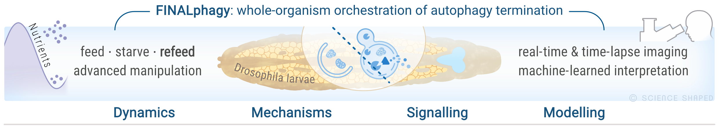 When an organism experiences physiological stresses, such as nutrient starvation, it activates several mechanisms to promote its survival. One of these mechanisms is autophagy, which is a catabolic pathway conserved from yeast to man that functions as a recycling system during normal physiology, and which helps provide nutrients to sustain essential cellular processes during starvation. Although autophagy is an intensively studied process that plays a major role both in normal development and in a wide variety of diseases, several important aspects of autophagy remain to be elucidated. For instance, whereas the vast majority of studies have focused on how cells regulate the activation of autophagy, it remains largely unknown how cells and organisms shut off autophagy in response to returning nutrient availability. The limited knowledge of autophagy termination is partly due to a lack of available tools and appropriate methods. Addressing these challenges will not only provide important insight in this fundamental aspect of the autophagic process, but may potentially also identify new targets for development of drugs to manipulate this phase of autophagy. In FINALphagy I will develop new genetic and computational tools to quantify and manipulate the temporal dynamics of autophagy in an entire organism. I will unravel key mechanism of autophagy termination in individual cells within a tissue and dissect how this connects to systemic signaling and behavioral changes. This will generate a comprehensive toolbox for time- and space-resolved manipulation and quantification of autophagy levels, produce a whole-organism map of autophagy responses at the tissue-level, and conceptualize our understanding of the dynamics of autophagy regulation in an entire organism during changing nutrient levels.