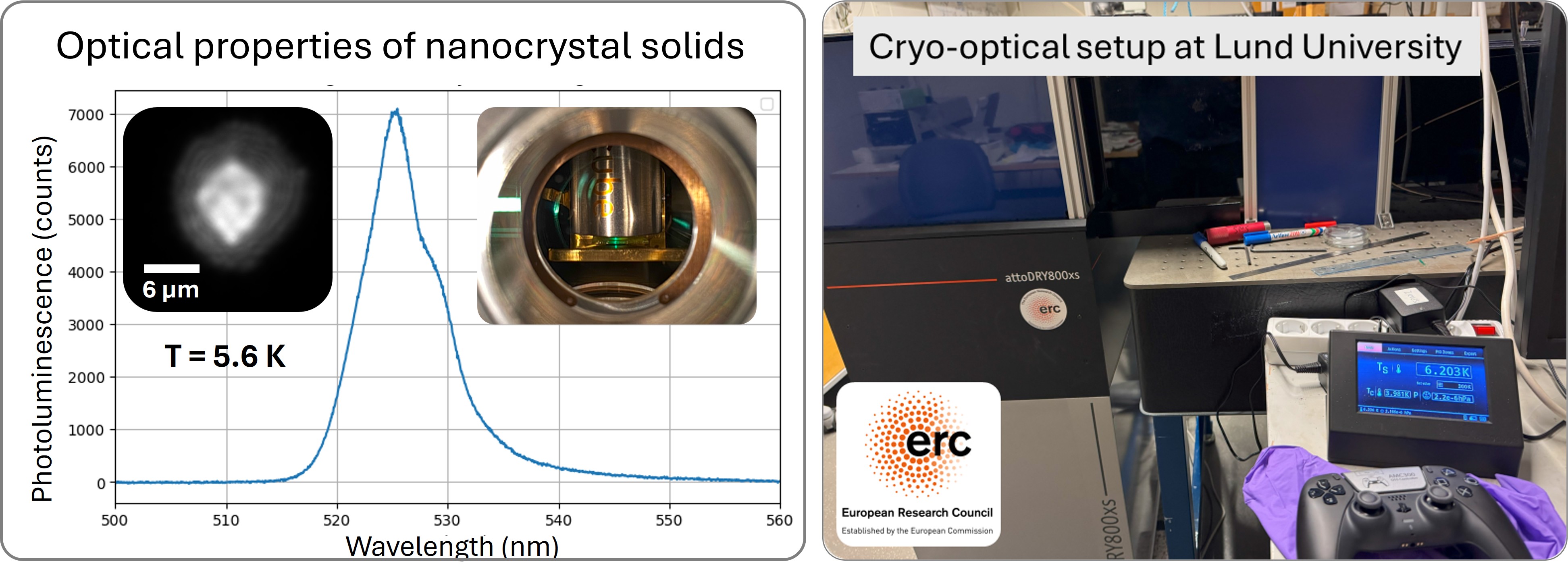 In parallel, methods were devised to study how light interacts with these nanocrystal solids. Construction of the specialized microscope system was started, incorporating an optical cryostat, allowing precise cooling of nanomaterials to liquid helium temperatures while enabling optical microscopy and spectroscopy. This setup facilitates examinations of light emission from individual nanocrystal solids at various temperatures and under different experimental conditions. Ongoing efforts are extending the system’s capabilities to include further optical characterization tools, such as measurements of emission lifetimes and quantum properties (e.g. photon correlation).
