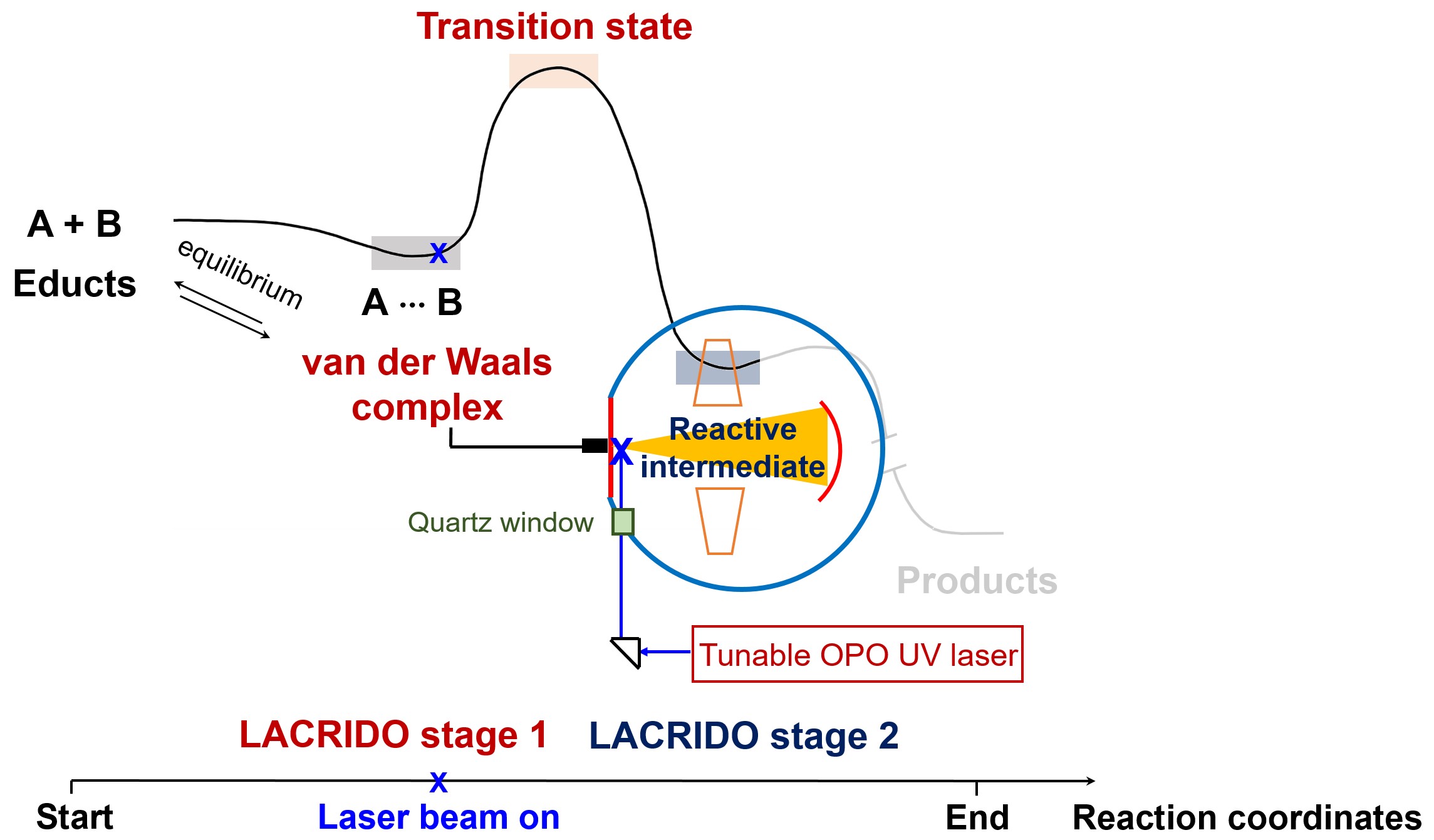 LACRIDO comprises two stages. The first stage focuses on detecting van der Waals complexes formed by reactants. These complexes provide crucial insights into the initial interactions and 3D arrangements of the molecules before a reaction occurs. This stage lays the groundwork for the more ambitious second stage where reactive intermediates are (1) formed by laser activation; (2) adiabatically frozen and locked in the collision-free zone of the molecular jet where the rotational temperature is close to the absolute zero-point; then (3) captured exploiting the strength of microwave spectroscopy in its specificity of conformation-sensitive detection unrivalled by any other type of spectroscopy and chemical methods.