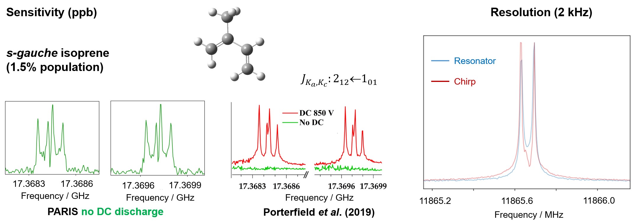 Concerning sensitivity, the PARIS spectrometer has reached a new benchmark in the ppb range. A demonstration is the detection of the s-gauche conformer of isoprene. Isoprene exists as the s-trans conformer (98.5% abundance at room temperature), with the s-gauche conformer comprising only 1.5% of the population. The detection is further challenged by its low dipole moment of 0.36 D. Previously, this conformer required a DC-discharge to enhance its population for detection (Porterfield et al., J. Phys. Chem. Lett., 2019). Remarkably, the PARIS spectrometer achieved detection under standard jet-cooled conditions without requiring additional enhancements, underscoring its exceptional sensitivity.