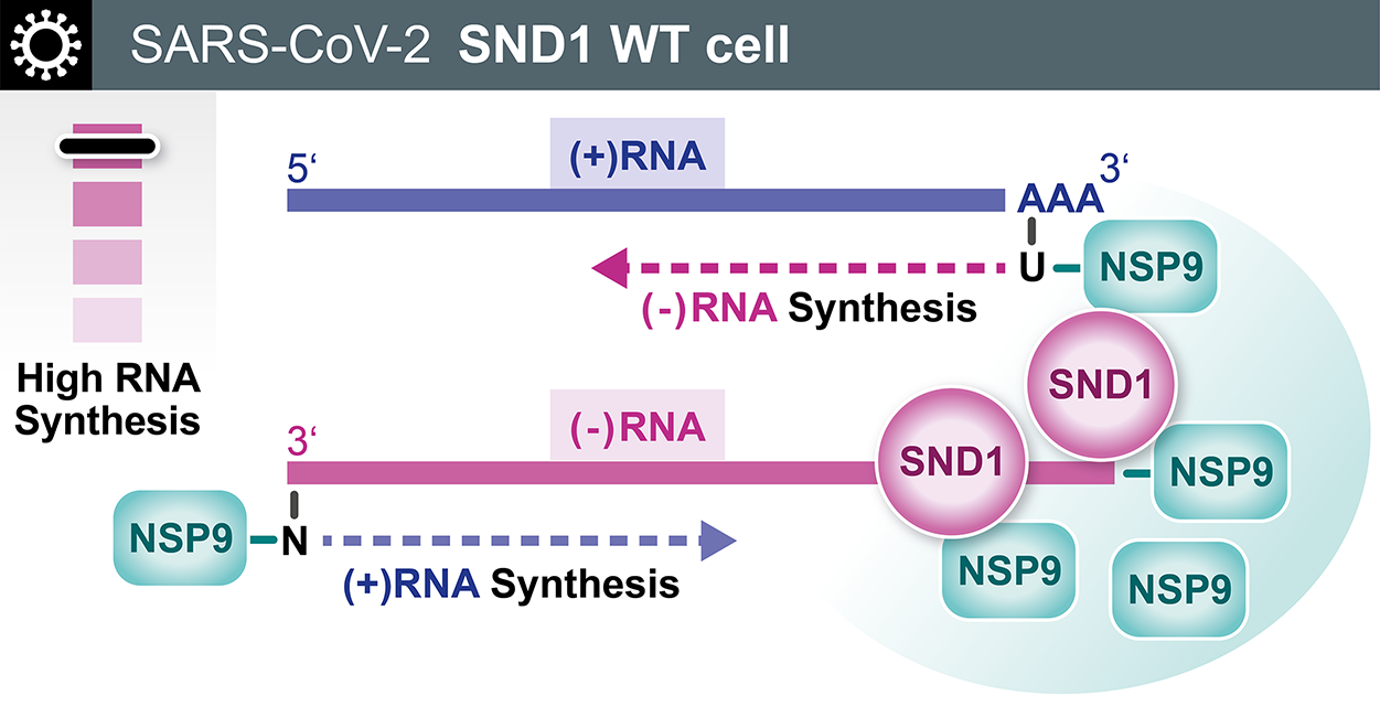 Next, we focused on potential regulators of viral RNA synthesis. As part of Objective 2, we developed DiVi-RAP-MS to analyze proteins bound to different viral RNA species. Using DiVi-RAP-MS we recorded the most comprehensive collection proteins bound to SARS-CoV-2 RNAs available to date. We identified the host protein SND1 among proteins with a clear preference for binding subgenomic viral RNAs. Mapping SND1 binding sites in infected cells revealed an unusual pattern: SND1 selectively binds the lowly abundant negative-sense RNA of SARS-CoV-2. Since negative-sense RNA serves as an amplification template for producing new viral RNA, we measured nascent viral RNA synthesis and found a dramatic loss of new RNA production in SND1 depleted cells. Consistently, double-membrane vesicles that make up the viral replication factories, were significantly smaller in SND1 depleted cells. We found that SND1 directly interacts with the viral protein NSP9. Interestingly, the viral RNA polymerase attaches a single nucleoside monophosphate (NMP) to the N-terminus of NSP9. Our data indicates that NMPylated NSP9 serves as a starting point to initiate viral RNA synthesis, leading to the covalent attachment of NSP9 to SARS-CoV-2 positive- and negative-sense RNA. Hence, we identified a novel protein priming mechanism utilized by SARS-CoV-2. We could further demonstrate that the priming activity of NSP9 is regulated by the host factor SND1. These insights represent a fundamental advance in our understanding of the SARS-CoV-2 RNA synthesis mechanism.