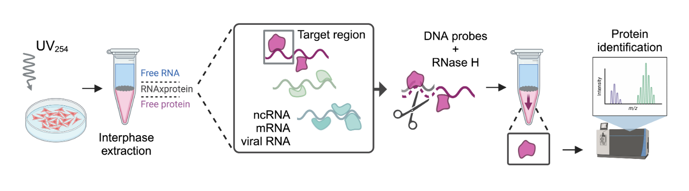 To facilitate the temporally-resolved mapping of RNA-protein interactions at different stages of the viral replication cycle in Objective 2, we developed an entirely novel RNA interactome capture technology: SHIFTR. SHIFTR relies on the highly efficient enrichment of crosslinked protein-RNA complexes in interphases during organic phase extraction and uses a sequence-specific RNA depletion procedure to selectively remove a single RNA species or RNA region. Digestion of the RNA component releases the protein, which then shifts to the organic phase (hence SHIFTR), from where the it can be identified by mass spectrometry. SHIFTR is a revolutionary tool because it is the only methodology that can interrogate specific RNA regions and their interacting protein in any endogenously expressed RNA in its native configuration without the need for genetic manipulation. We applied SHIFTR to SARS-CoV-2 and, for the first time, map interactions of known regulatory regions in authentic viral RNA, such as the 5’ leader sequence or the 3’ UTR.