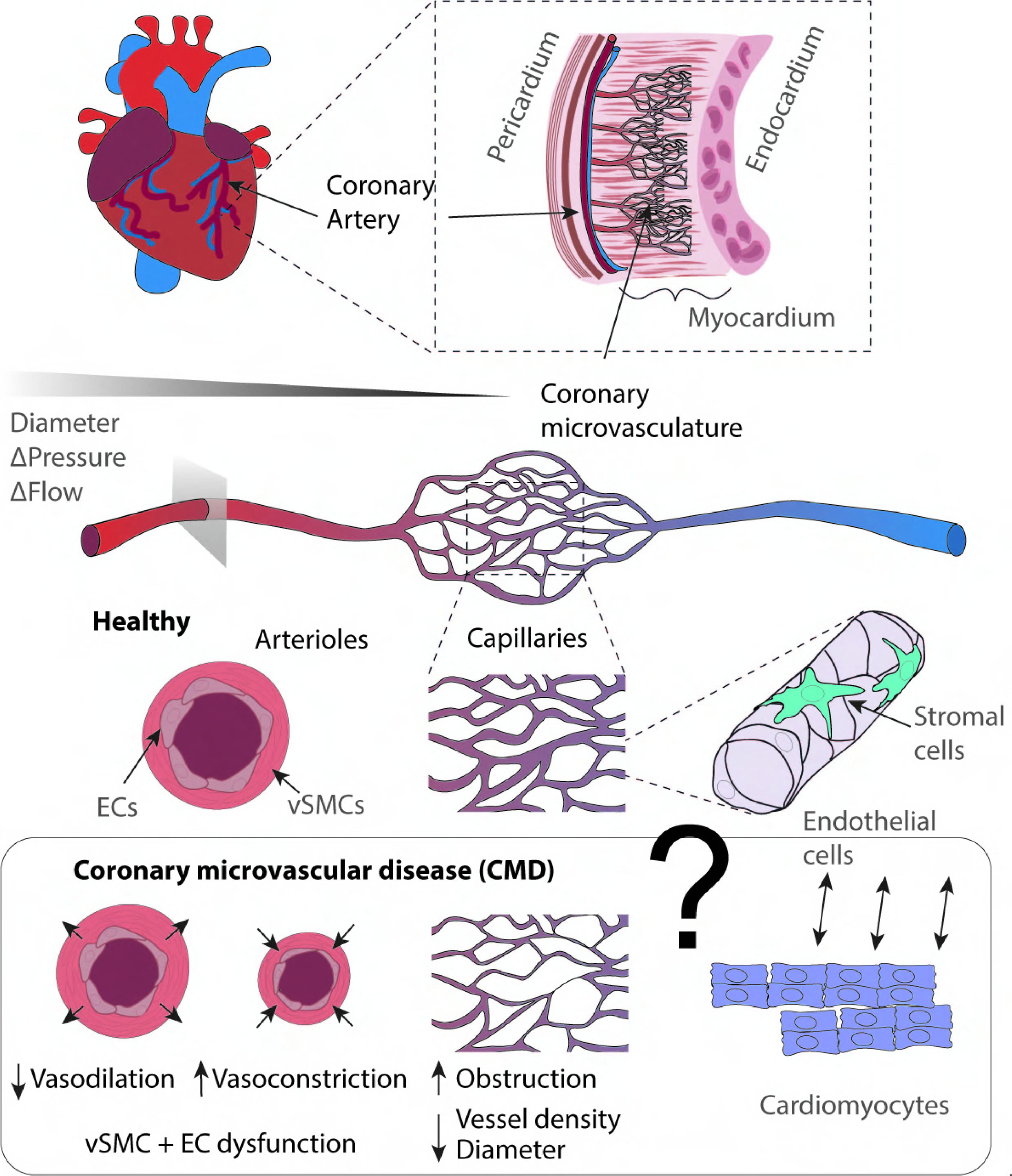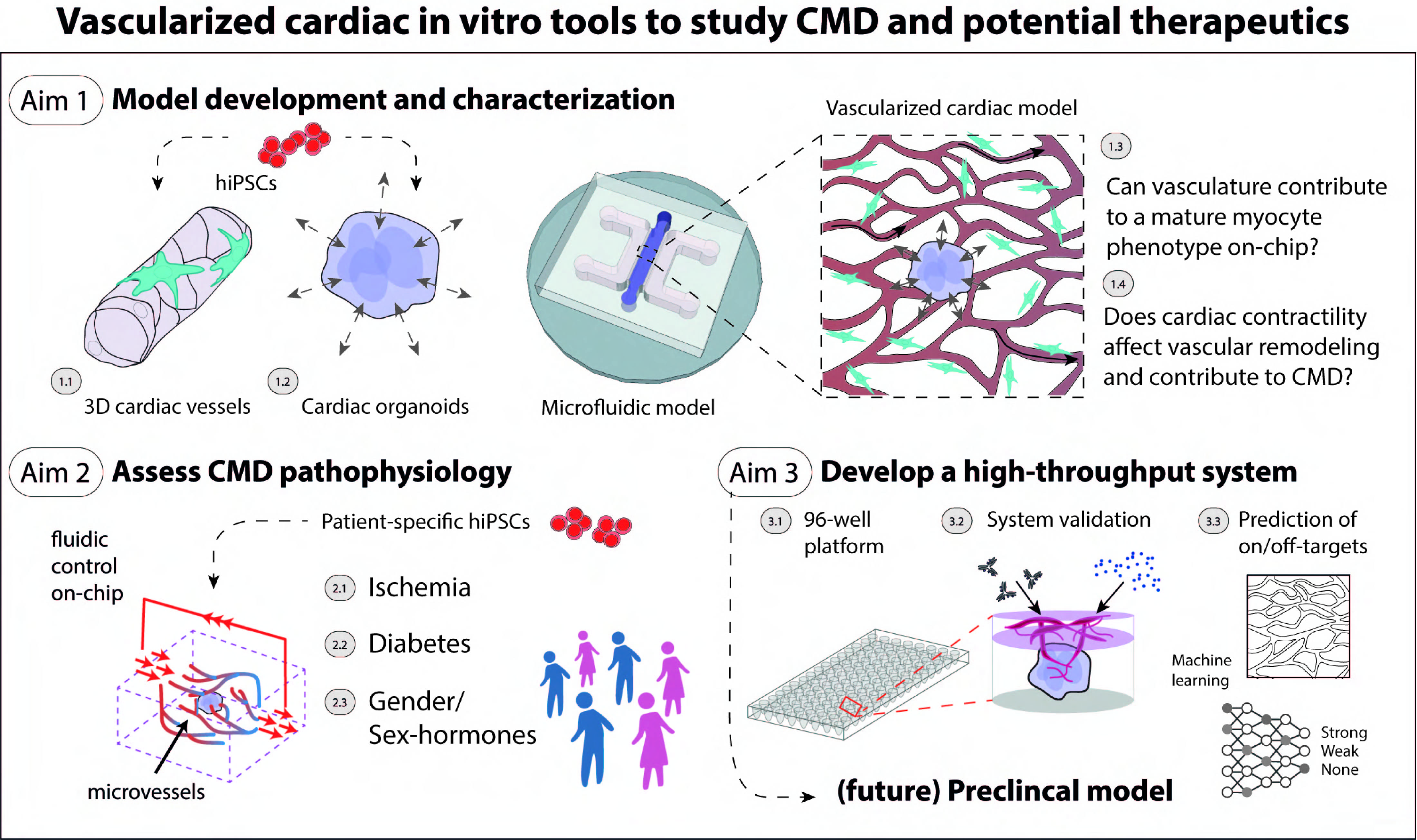Coronary microvascular disease (CMD) is a significant healthcare challenge, contributing to ischemic heart disease, the leading global cause of mortality. CMD is associated with dysfunction of small coronary vessels due to aging, obesity, and metabolic diseases, leading to reduced blood flow and oxygenation in the heart (Figure on background). Despite its widespread impact on health, our understanding of CMD is limited to animal studies, which do not accurately replicate human pathophysiology and fail to reveal cellular interactions in a controlled manner. Consequently, there is an urgent need for a humanized in vitro model to mimic CMD.