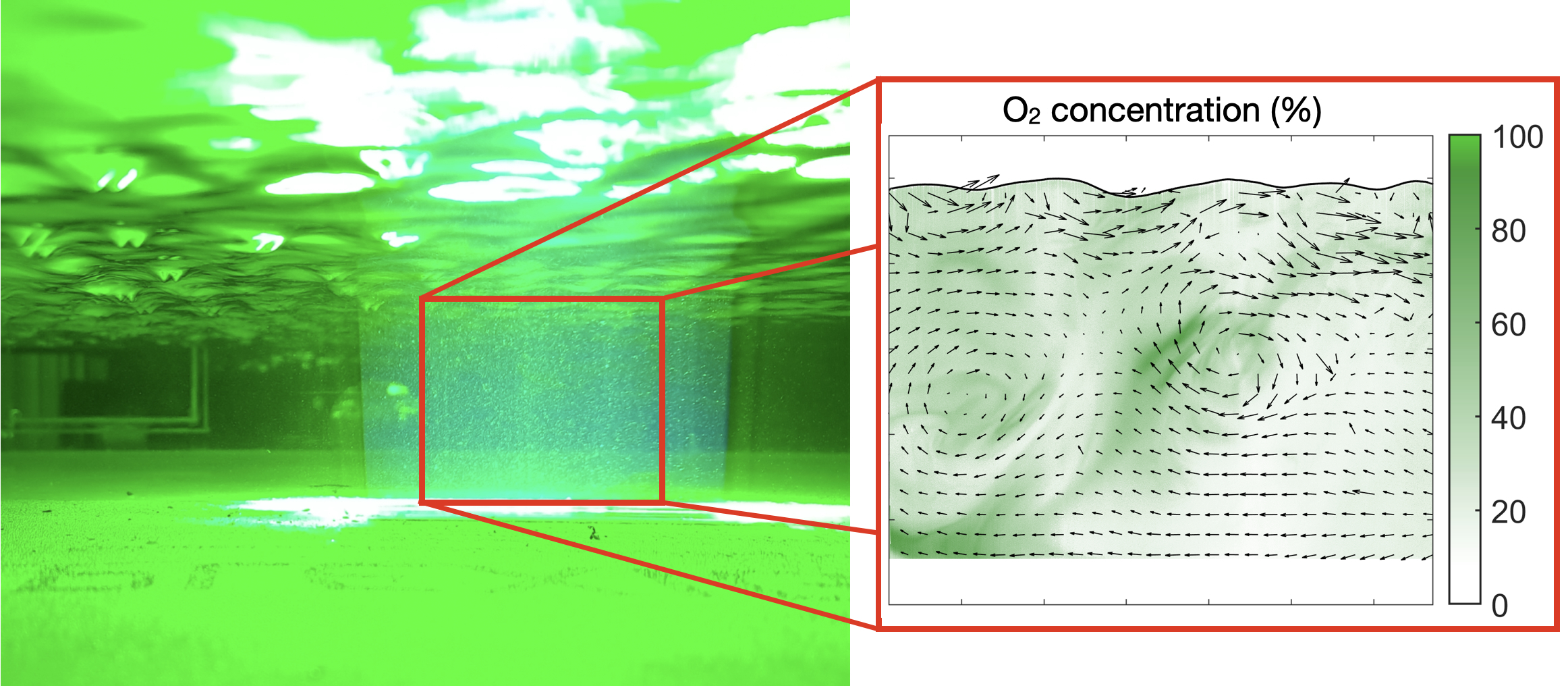 To measure these flows, we developed a novel synergy of measurement techniques. We use separate but simultaneous laser diagnostics to capture the velocity field in the water flow, the air-water interface, and the instantaneous gas concentration in the water. This setup allows us to observe an eddy formed at the air-water interface capture oxygen and transport it into the flow. Such detailed imaging of flows with deformable interfaces has not been possible before, and this capability marks a significant advance in our ability to understand transport processes at gas-liquid interfaces.