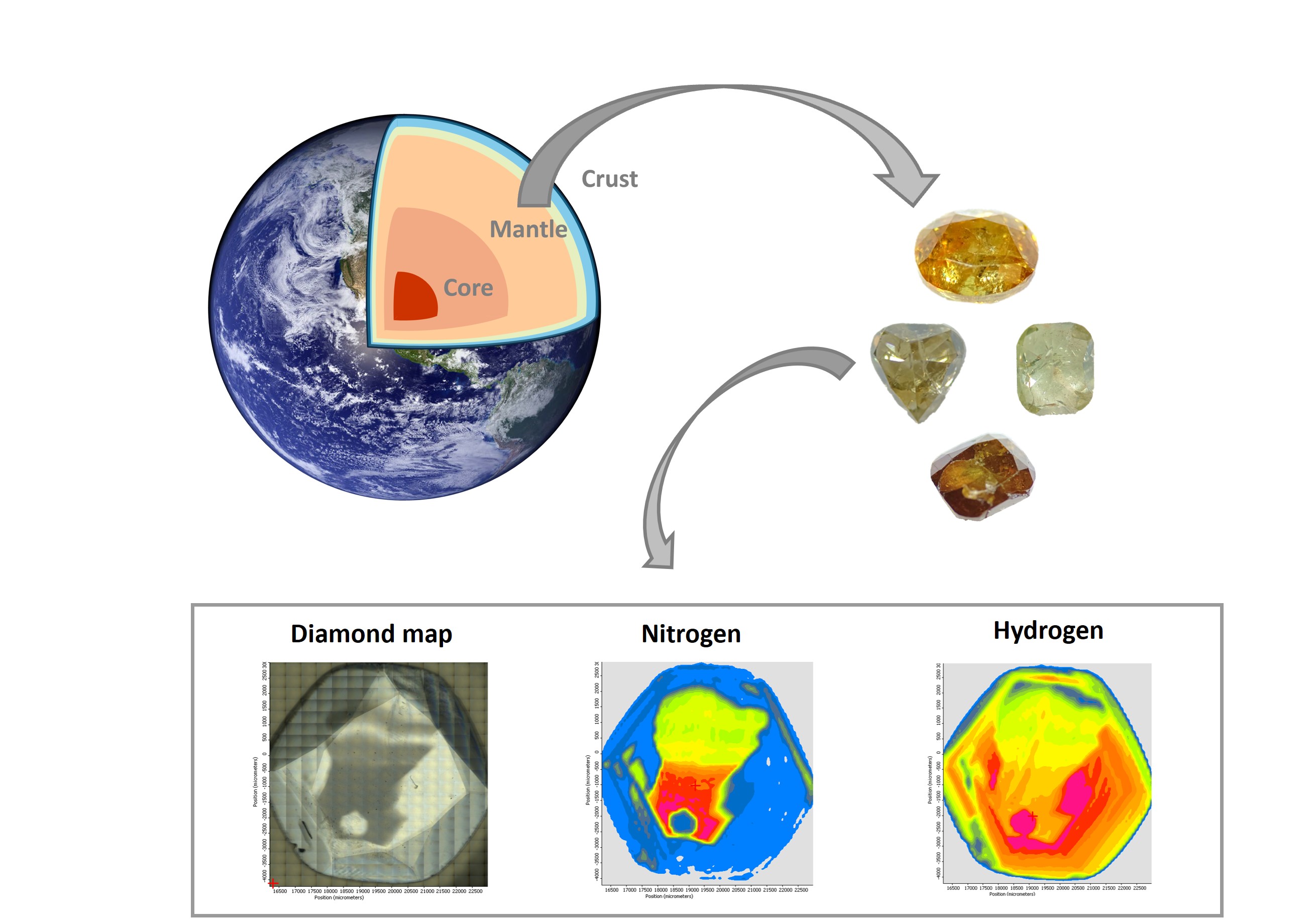- The behaviour of H in diamonds was largely unknown until now as only few “late forming” H-defects had been identified. Our results revolutionized what we know about H in diamonds, particularly the formation and early aggregation of N/H-defects opening several new research directions. Our work shows that substitutional N-defects trap interstitial H in diamond. With continued mantle annealing, the number of H-defects decreases as they aggregate to form fewer, more thermodynamically stable defects. The identification of the “first-formed N/H-defects in diamond” proves that H is trapped during, or shortly after, diamond formation preventing H re-equilibration with the mantle. We propose that the H isotopic composition in N-bearing diamonds is preserved after formation and thus reflects that of the diamond-forming fluid. This has crucial implications for relating the H isotopic composition of diamond to primordial sources of H in the mantle and thus to the origin of Earth’s water.
