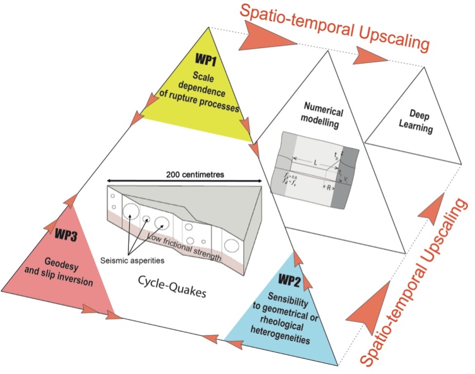 Thirdly, we examined how frictional heterogeneities influence seismic cycle dynamics. Initially, we hypothesized that brittle and ductile asperities would primarily affect rupture propagation. Instead, we observed that they predominantly control the emergence of fault afterslip. To our knowledge, this represents the first clear laboratory evidence of fault afterslip during seismic cycles. These results were published in January 2025 in EPSL.