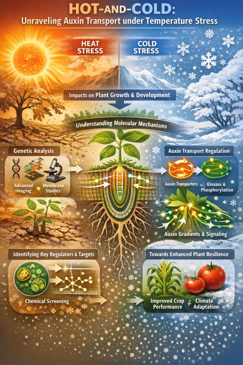 The HOT-AND-COLD project aims to elucidate the molecular mechanisms regulating auxin transport in response to temperature stress at tissue- and cell-type-specific resolution. To achieve this, we investigated temperature-dependent regulation of auxin transport components using molecular, genetic, and imaging-based approaches. We identified key auxin transporters that respond rapidly to temperature changes and characterized a set of temperature-responsive kinases implicated in the regulation of transporter activity through phosphorylation. In parallel, we analyzed the impact of temperature stress on root cell membrane properties and demonstrated that membrane remodeling constitutes an additional regulatory layer influencing auxin transport. Using advanced imaging techniques, we showed that temperature stress alters auxin distribution across distinct root cell types, leading to adaptive changes in root developmental patterns associated with enhanced tolerance to temperature extremes. Furthermore, we established and validated a new experimental technique in our laboratory to investigate translational regulation of auxin transport components under temperature stress. In addition, a chemical genomics screen was performed, will result in the identification of small molecules that perturb temperature-responsive pathways and point to previously uncharacterized regulators of auxin transport. Overall, the project has delivered new mechanistic insights into temperature-dependent regulation of auxin transport, identified molecular regulators and membrane-associated processes involved in this response, established novel methodological tools, and generated chemical probes for future dissection of temperature-responsive signaling pathways. These outcomes provide a foundation for strategies aimed at improving plant resilience to temperature fluctuations.