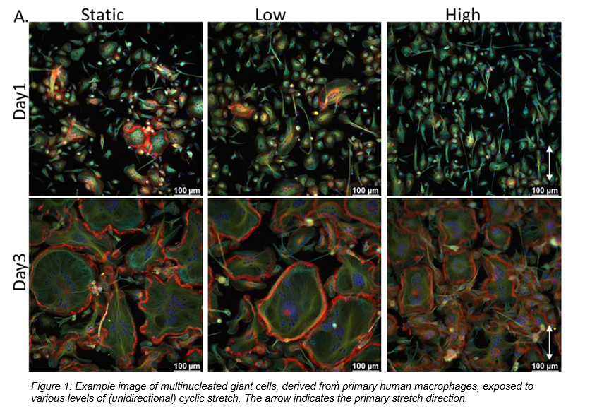 Additionally, we established standardized cultures for primary human macrophages and foreign body giant cells (FBGCs). Due to the cells' sensitivity to environmental factors, methodological inconsistencies in existing literature led to varying results. A systematic review of methodologies has produced standardized protocols vital for the ERC project and the broader community. Despite their importance in medical grafts, original research on FBGCs could be more extensive, highlighting our contribution. Establishing this methodology has now enabled us to for the first time systematically study human FBGCs in dynamic conditions. This represents an essential advancement when aiming to develop regenerative implants for mechanically loaded applications, which is a highly active area of research.
