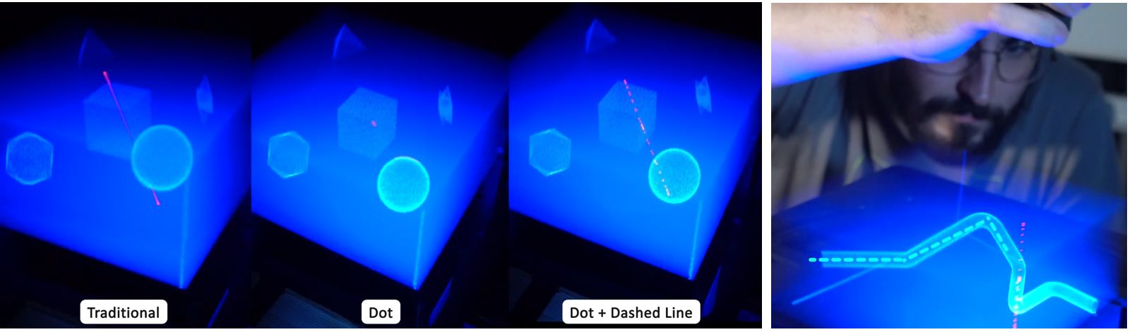 In the short-term prototyping, we explore the benefits of direct interaction, emulating volumetric displays in virtual reality environments (Ardaiz, 2024). We modified a traditional laser pointer (Fernandez, 2024) for being able to point to 3D position inside a volumetric display by adjusting its timing. This is not considered direct interaction but it is a simple device that makes easier interacting with existing applications for volumetric displays, thus facilitating the demonstration of the concepts towards InteVol. We are exploring the use of elastic diffusers that allow the user to get the hand inside volumetric displays.