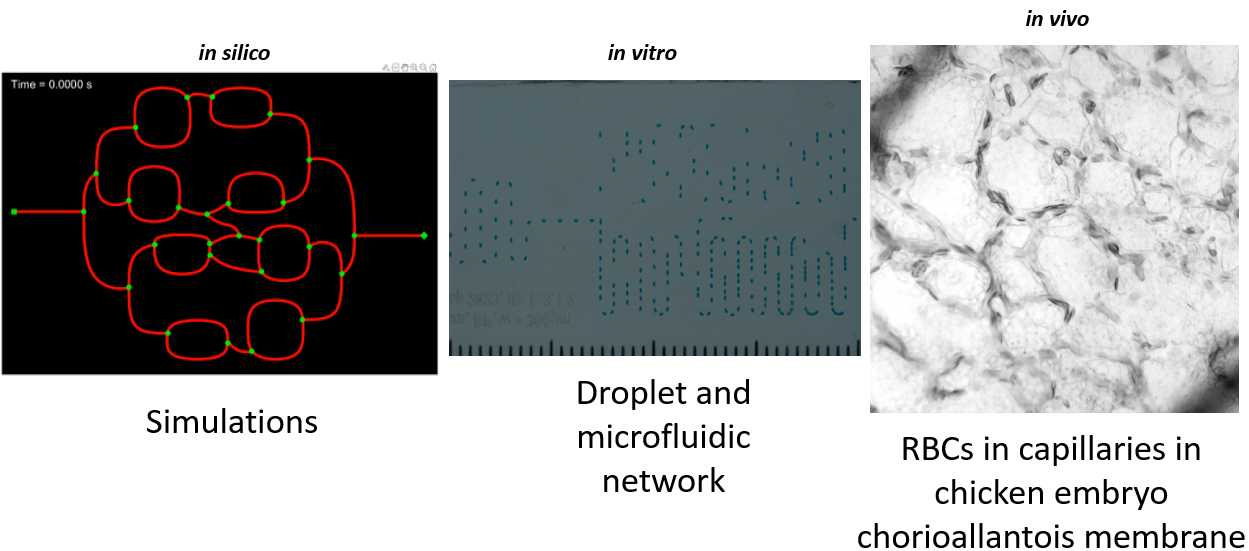 network properties in highly engineered microfabricated devices. We aim to understand RBC distribution patterns in capillary network and the consequences during vascularization and organogenesis. Our approach is (i) to observe the in vivo RBC fractionation in chick embryo vasculature, (ii) to develop its in vitro analogue using droplet microfluidics, (iii) to develop in silico model and determine the governing parameters. This project will discover the foundations of particle transport phenomena in nonlinear bifurcating networks and address the long-lasting question of RBC nonuniformity in microcirculation and its implications as a groundbreaking contribution. Another key outcome is the correlation between RBC heterogeneity to corresponding organ growth by visualising RBC distrubtions at single cell resolution and monitoring vasculogenesis of the network simultaneously. With this approach, we aim to develop a fundamental understanding of vascularization dynamics as well as the implications of non uniform RBC distribution in tissue development. Additionally, the project develops several tools and techniques for vascularized organoid development and organ-on-chip systems.