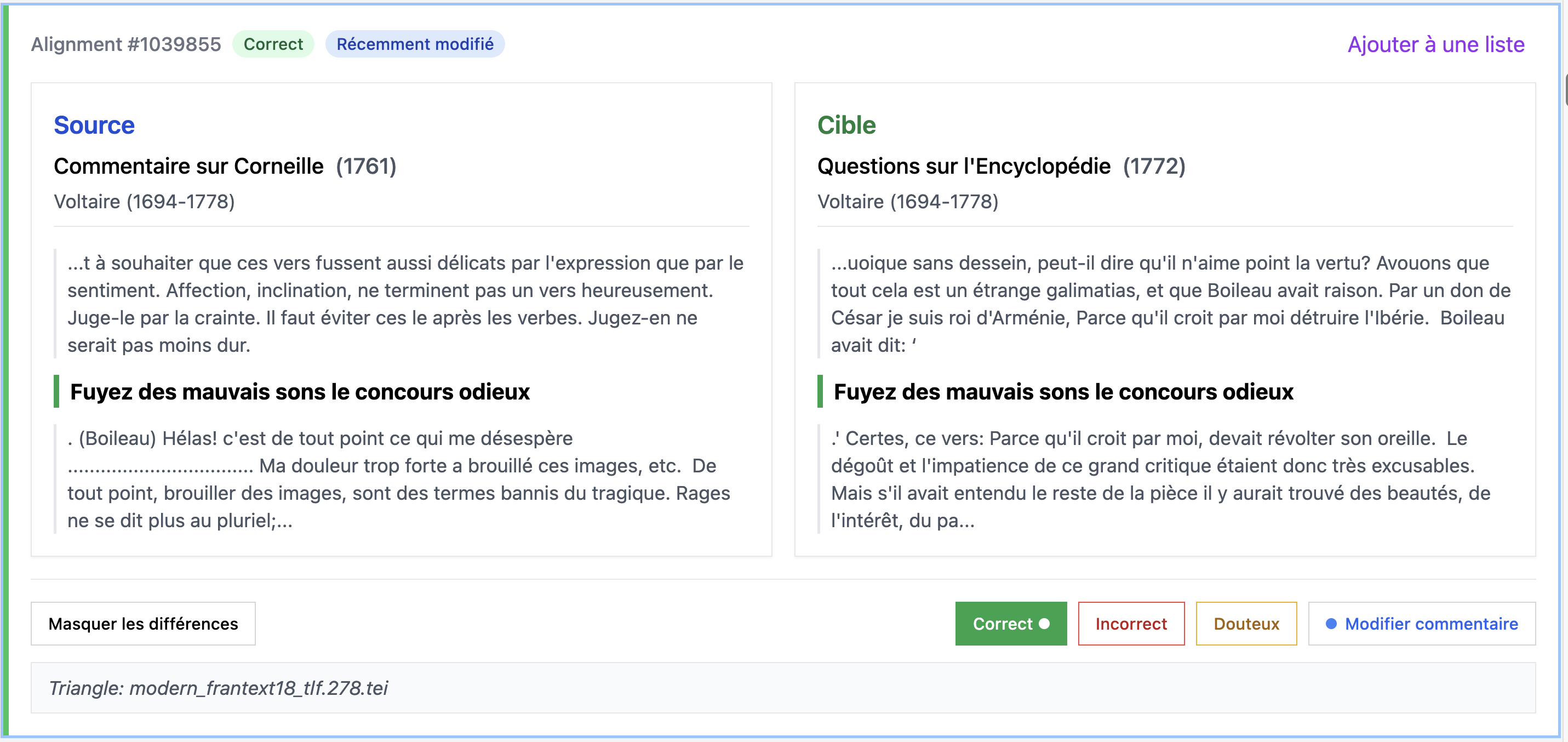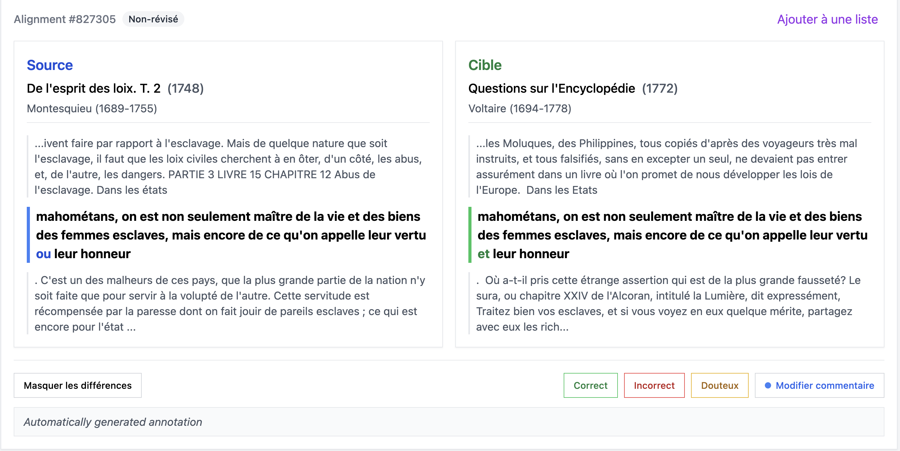 We have also recently developed a user interface for the annotation and analysis of our filtered alignments (see image 2). This will allow team members to eliminate invalid alignments that were not filtered in phase one, and also train new models for alignment filtering and semantic analysis. Our new software engineer will also develop a generative-AI based suggestion system to present users with possible positive and negative alignements, which will streamline the annotation process when we move towards other datasets such as the pamphlets and press. To our knowledge, no such suggestion system exists for text reuse research software. The codebase is available at the project's Gitlab.