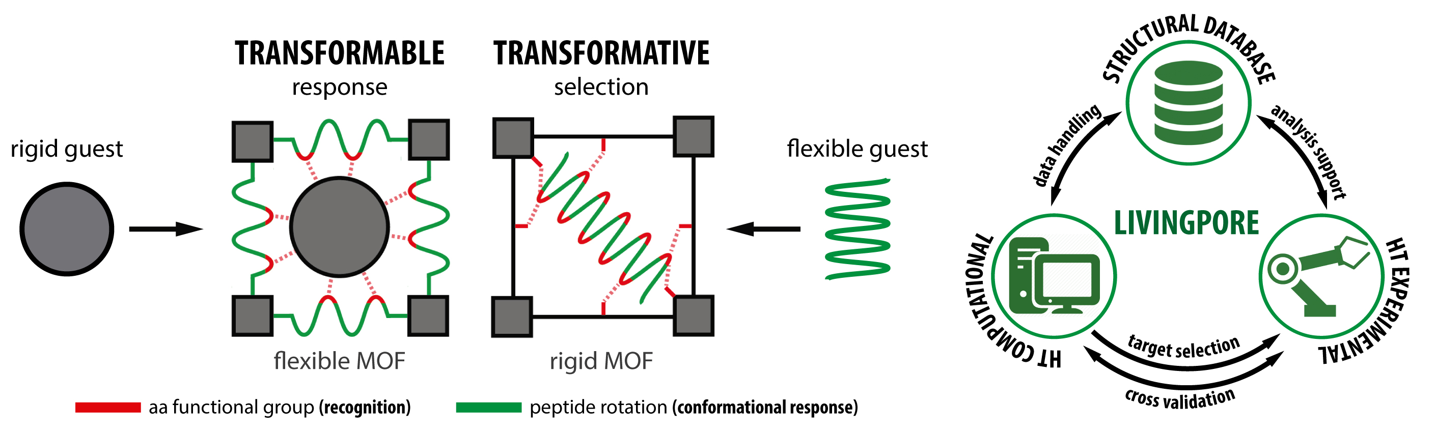 LIVINGPORE is an ERC-funded research project that introduces a paradigm shift in porous material design by developing adaptive MOFs with programmable porosity. By integrating amino acid sequences within MOF structures, we aim to create materials that selectively recognize and transform molecular guests. This approach leverages principles of protein folding and molecular recognition, providing a new level of structural and functional control in crystalline materials.