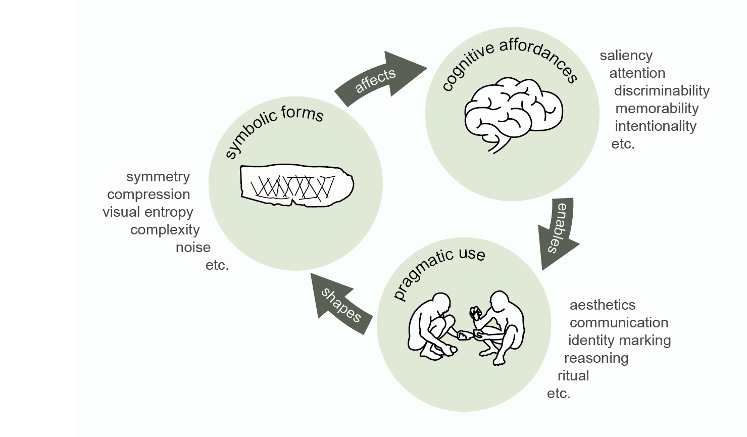 eSYMb builds on the core hypothesis that symbolic artefacts evolved through processes of social transmission and incremental adaptive refinement to become better tools of the mind. We assume that these developments are measurable as cognitive implications of the structural changes to symbolic artefacts, which can be made subject of test and simulations in experiments using the archaeological artefacts as stimuli. Artefacts can serve different symbolic functions, each with their profiling of cognitive affordances. By investigating how different artifacts resonate with processes of, for instance, visual saliency, memory, and discrimination, we can quantitively inform the interpretation of their potential past symbolic use.