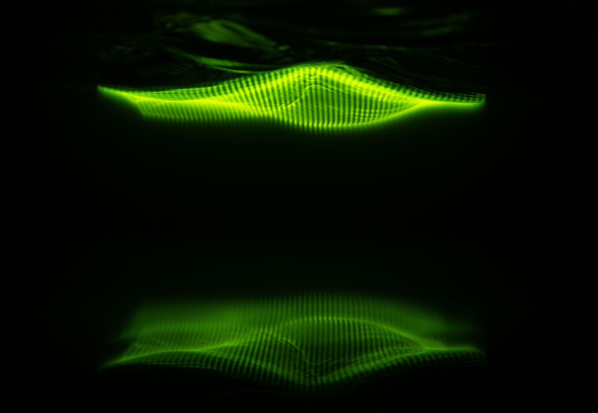 Very recently, the acquisition stage of the second and so far greatest experimental campaign was concluded, where three state-of-the-art measurement techniques were used simultaneously to study the full wave-turbulence-current system: the velocity field in a vertical plane beneath the wavy surface, the mixing in of a fluorescent agent which represents transported gas-saturated water, and infrared imaging of the surface to visualise the turbulence at the surface itself. We can now directly observe how the background turbulence is drastically changed by incoming waves, creating long cylinder-like eddies. We can literally watch how these eddies grab hold of the water at the surface and pulls it into the deep, replacing it with new water, precisely the process whereby gas and heat enter the real-world ocean. Extracting the results from the raw data will take some time, but will provide an unprecedented look into the processes that mix the upper ocean, at a level of detail, control and completeness not achieved before. The result of more than a year of planning and testing, this experiment is a major milestone and will give insights– and almost certainly new questions – which will guide the final stages of the project.