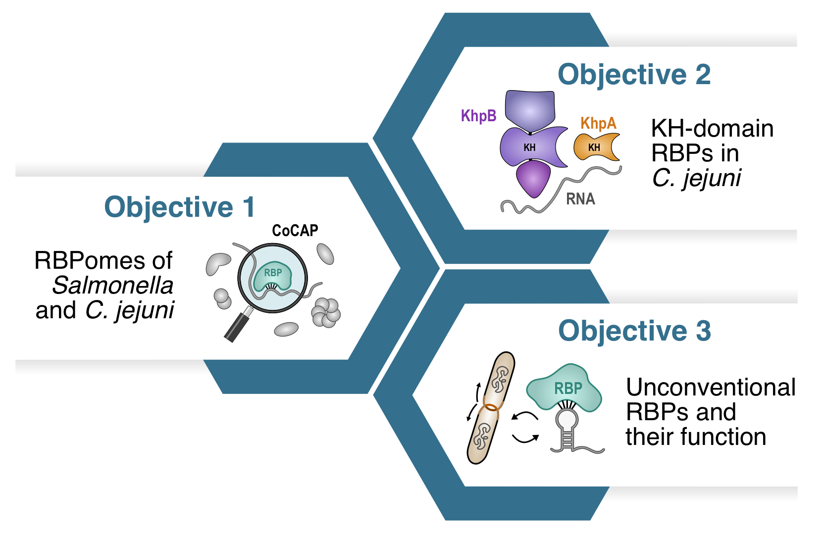 Figure 1: Objectives of bacRBP. Our overarching hypothesis is that a vast, unexplored universe of unconventional RBPs exists in bacteria that mediate key biological processes. In Objective 1, we aim to expand the set of known bacterial RBPs by applying CoCAP to Salmonella and C. jejuni as well as examine potential functions of selected transcriptional regulator RBP candidates. In Objective 2 we explore the cellular roles and underlying molecular mechanisms of the KH-domain proteins KhpA/B in C. jejuni. In Objective 3, we aim to find out whether unconventional RBPs affect bound RNAs or vice versa.
