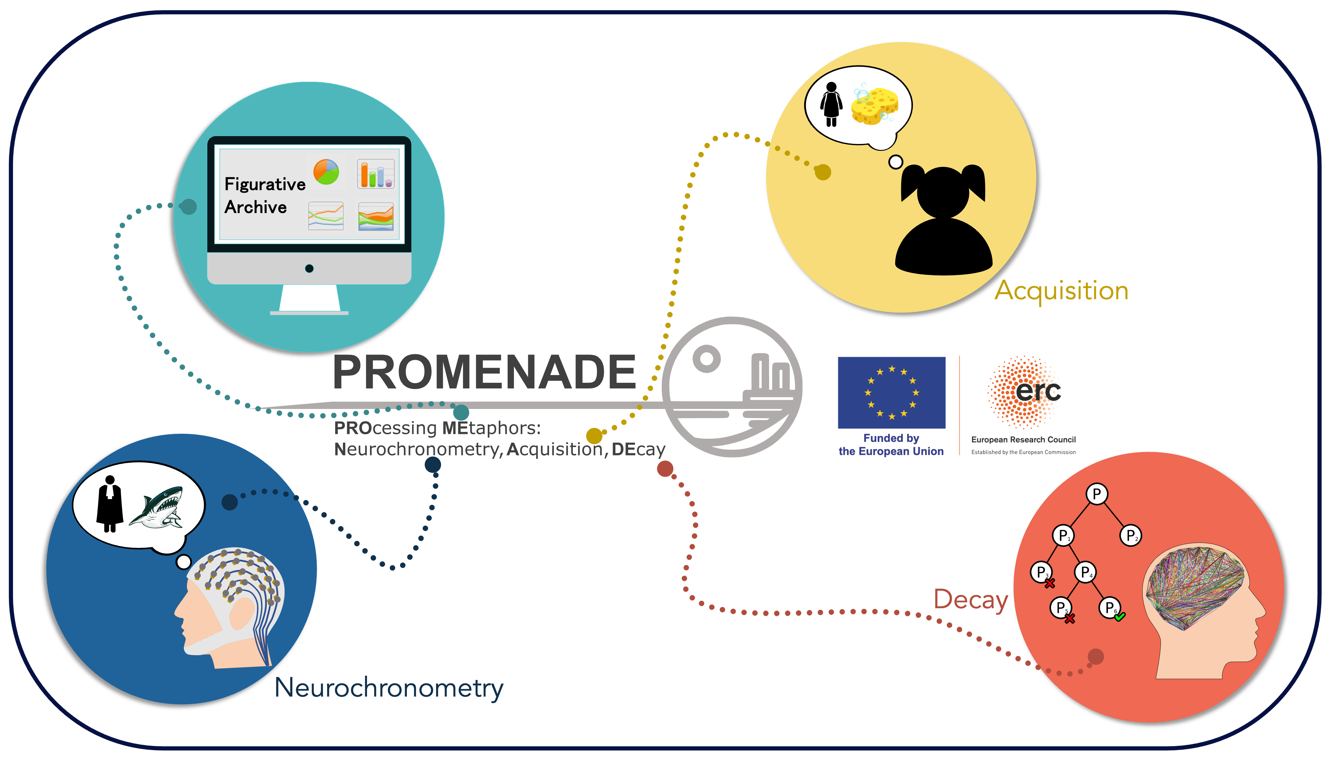 The overarching objective of PROMENADE (2023-2027), PI Valentina Bambini, is to shape a comprehensive account of metaphor processing, starting from theoretical grounds in linguistic pragmatics and embracing a multidisciplinary program of empirical research on the brain’s electrical response, the acquisition patterns in typical development and the impairment in clinical groups. In particular, the project seeks to ascertain the role of mental images in metaphor, whether we ‘picture’ metaphorical meanings, how these sensory representations interact with propositional inferencing, and whether multimodality helps or hinders comprehension across populations. PROMENADE includes four WPs.