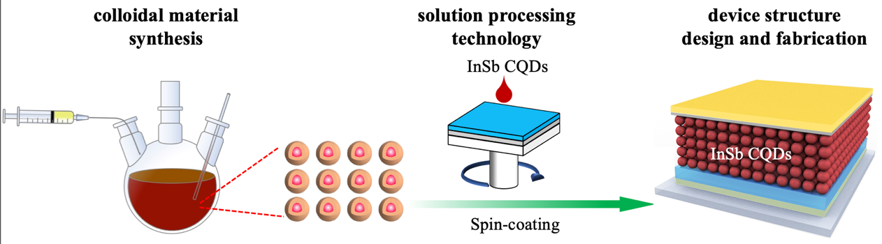 (iii). Fabricated the InSb CQD SWIR photodetector, which demonstrates competitive features, including a wide linear dynamic range exceeding 128 dB, a maximum EQE of 25% at 1240 nm (and 12% at 1420 nm), a fast photoresponse time of 70 ns, and a specific detectivity of up to 4.4 × 1011 jones.