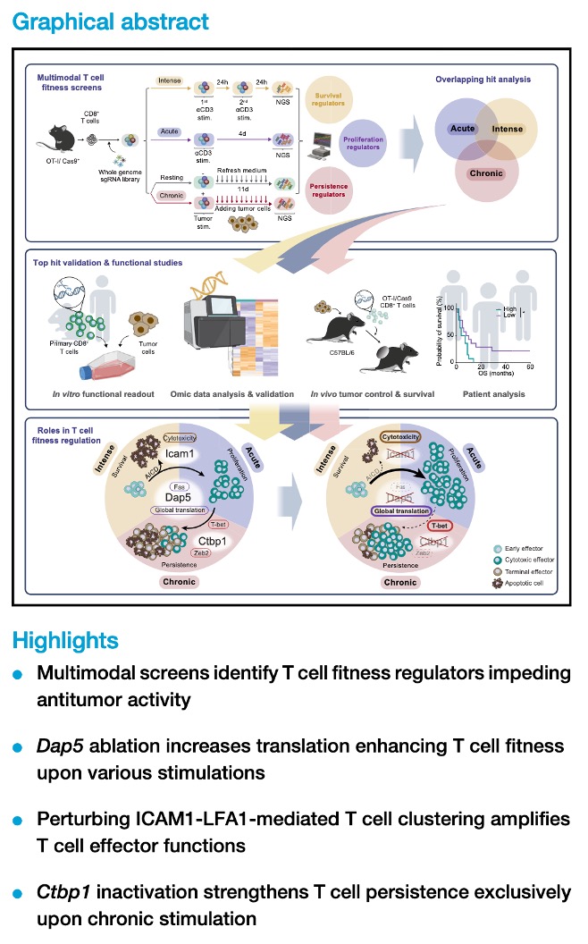 1. Lin, C.P. et al., Multimodal stimulation screens reveal unique and shared genes limiting T cell fitness. Cancer Cell, 2024. 42(4): p. 623-645.e10.