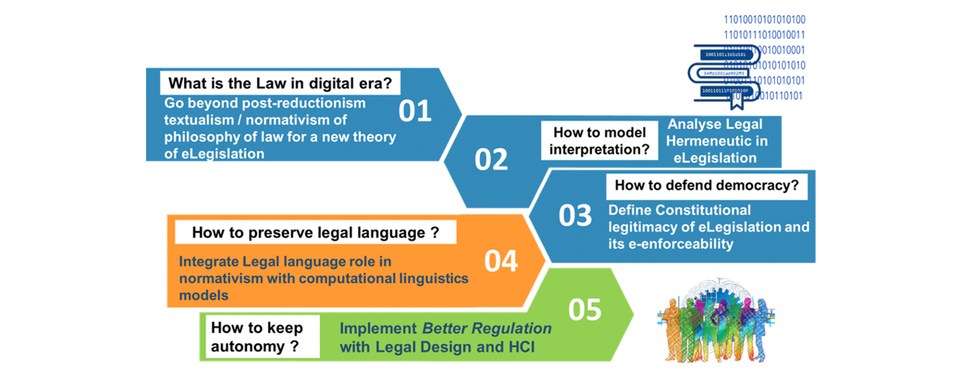 Our research combines a high level of technical knowledge with legal theory and democratic principles, producing a unique product of results, including the theory of language and visual communication methodologies. We have developed Hybrid AI models for managing the structure of legal sources, semantics, and hidden knowledge in legal language (e.g. definitions, normative references, and the similarity of arguments). In particular, we use Framenet to capture the semantics of the legislation without entering into the logic formalization. We have won a “Manifestation of Interest” launched by the Chamber of Deputies of Italy on “AI in Parliament” (see https://interoperable-europe.ec.europa.eu/collection/public-sector-tech-watch/genai4lex-b-ai-powered-legislative-support-italian-chamber-deputies(odnośnik otworzy się w nowym oknie)).