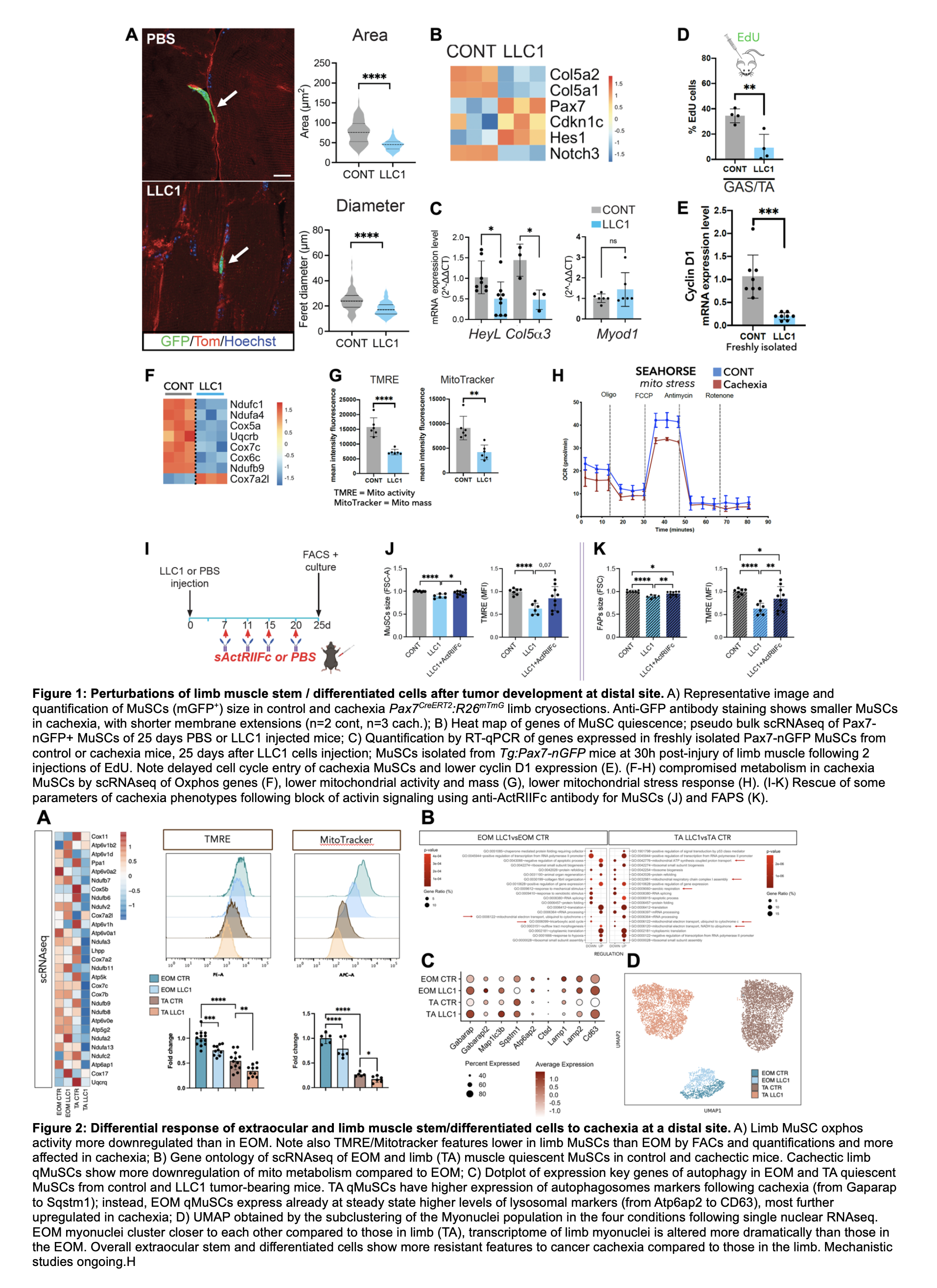3) Aim 4: Cancer cachexia, marked by decreased calorie intake and metabolic activity, affects skeletal muscle, leading to severe tissue loss. The mechanisms affecting muscle stem cells (MuSCs) during cachexia are unclear. Using the Lewis lung carcinoma (LLC1) mouse model, we examined the phenotype of MuSCs in different muscles at the level of morphology, metabolism, and autophagy. Our preliminary results point to differences in several of these parameters and these experiments are ongoing.