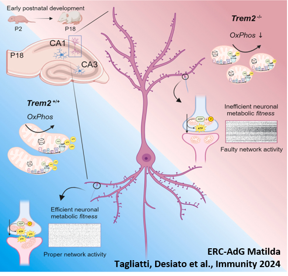 The nervous and the immune systems undergo a continuous cross talk, starting from early development and continuing throughout adulthood and aging. Defects in this cross-talk contribute to neurodevelopmental and neurodegenerative diseases. Microglia are the resident immune cells in the brain and are primarily involved in this bidirectional communication. During brain development, microglia control several key processes, including neurogenesis, myelin formation and synapse homeostasis. We have obtained indications that during the early postnatal period, microglia direct the genetic signature of specific subgroups of hippocampal neurons, shifting them toward defective metabolic and developmental patterns. This process is controlled by the microglial Triggering receptor expressed on myeloid cells 2 (Trem2), a gene associated to Alzheimer’s Disease. We hypothesized that, by causing imbalances during early maturation phases, dysfunctional Trem2 may have a striking impact on the adult brain, making it a more sensitive target for insults occurring during adulthood and aging. The present project, MATILDA, aims to address this possibility. We will map the hippocampal energetic profile on a single-cell basis, in the presence of proper or defective Trem2 expression and we will define through which mechanisms microglia and Trem2 control the neuronal transcriptomic phenotype. Once settled all methods, we will move to the hypothalamus, where the brain areas orchestrating the body energy homeostasis reside. Owing to the presence of transcriptionally heterogeneous neuronal subtypes and to a vast range of non-neuronal cells regulating systemic metabolism, food intake, and body weight, the hypothalamus represents a key structure to investigate the functional interaction of microglia with specific cell types and the outcomes of its dysregulation. We expect to identify novel mechanisms potentially contributing to metabolic decline, offering potential for new therapeutic strategies that could reverse immune-metabolic dysfunctions by modulation of hypothalamic microglial function.