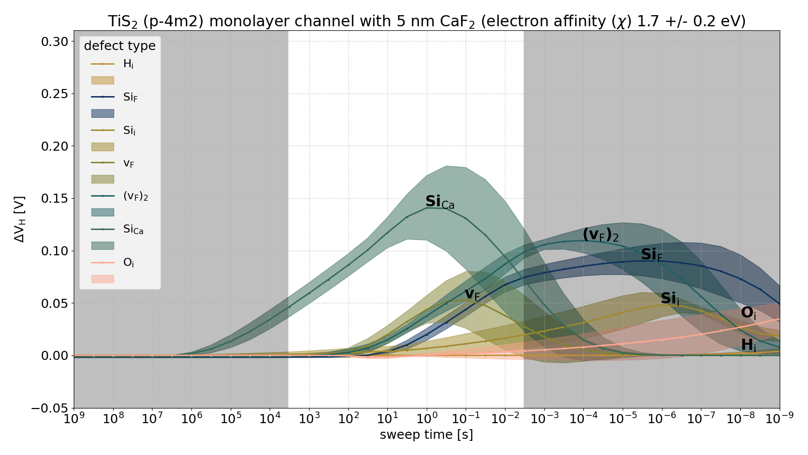 In order to allow for a better understanding of the experimental results and to provide guidance for future experiments, e.g. related to the choice of the best fluoride, various theoretical calculations were performed. Using hybrid-DFT methods, we calculated the parameters of a large variety of CaF2 point defects, which are critical for predictive stability and reliability simulations of 2D devices. These DFT parameters where then used in our open-source 1D device simulator Comphy (www.comphy.eu) to calculate transfer characteristics as well as hysteresis of fluoride-based devices. Thereby, F2GO systematically combines experimental growth, device fabrication, computational modeling, and defect analysis to advance fluoride-based electronics, with promising results that point to necessary optimizations for device reliability and industry application potential.