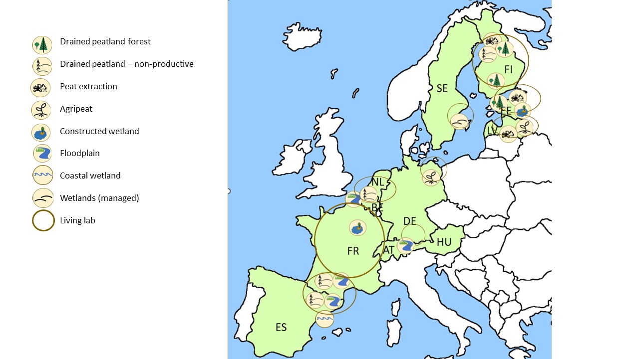 Our nine Living Labs (LLs), encompass a total of 33 sites situated in diverse European wetlands from north-to-south. Idea of LLs is to support and integrate interdisciplinary and multi-actor research on ecological, environmental, economic, and social issues. Experimental data from local sites are scaled-up and will be utilized e.g. by models to gain and understanding the potential impacts of upscaled wetland restoration measures. The LLs have chosen to improve existing knowledge relating GHGE, land use, socio-economic characterization and different levels of wetland restoration and its acceptance.