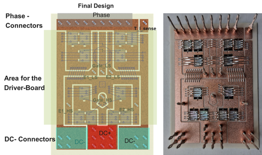 Realization: Two inverter concepts are build, including the radial integration of the inverter with the electric machine. Customized busbars are tested and produced, and the electric and thermal models are developed, and control strategy is under development to optimize the losses and lifetime