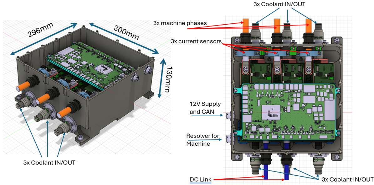 - Development of integrated and modular IMD designs to be applied in “multiaxel traction” concepts for heavy-duty long-haul trucks, allowing 150kW – 200kW at 1200 VDC per axle and validation in a test bench.