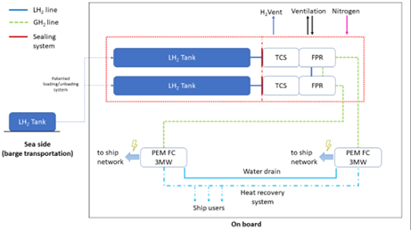 In addition to the main hydrogen fuel system, all the auxiliary systems (ventilation, inert gas, fire protection, gas detection, etc.) (see Figure 1) necessary for the operability of the hydrogen plant have been studied and defined in detail.