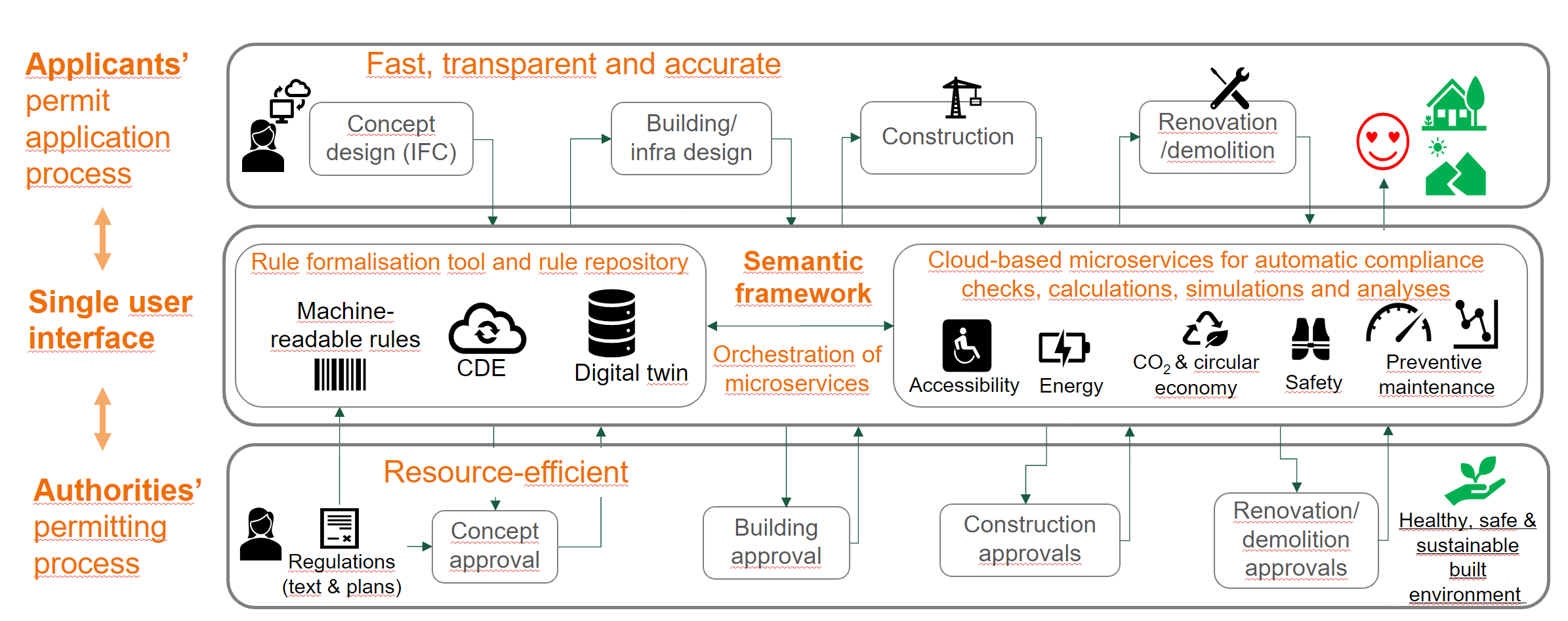 ACCORD's objective is to digitalise building permit and compliance processes using BIM and other data sources to improve the productivity and quality of design and construction processes, support the design of climate-neutral buildings, and advance a sustainable built environment in line with the EU Green Deal and new European Bauhaus initiative. These digitized processes must be human-centred, transparent, and cost-effective for the permit applicants and authorities. Another objective is to develop and integrate technical solutions for automating compliance checking of buildings in their design, construction, and renovation/demolition lifecycle phases. All this will be based on open and neutral data exchange standards.