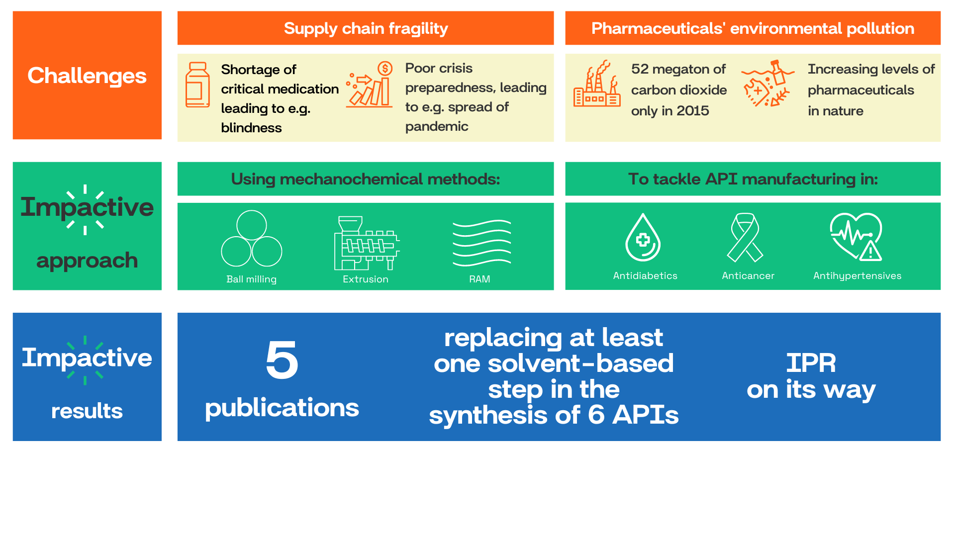 By achieving the objectives of the IMPACTIVE project and showing that mechanochemistry is a green, efficient, and affordable alternative to current API manufacturing methods, we will reduce environmental pollution, as well as the EU economy and supply chain stability. Recent data published by the consortium members showed that switching to mechanochemistry to produce a single API (among those listed World Health Organisation, WHO essential medicines) can reduce ecotoxicity and CO2 emissions by more than 85%, while also reducing the production costs by 12%. The use of mechanochemistry would, therefore, overcome some issues encountered in the solvent-based manufacturing through the provision of benefits such as: 1) solvent-free (or minimum solvent use) conditions, 2) safer reaction conditions, 3) efficiency enhancement, 4) lower costs, 5) CO2 emission reduction, and 6) Innovation in chemical space and process engineering.