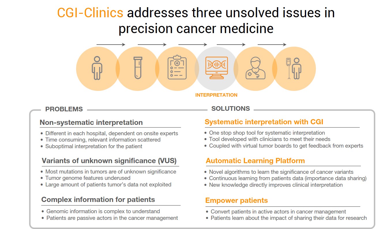 CGI-Clinics is a community-driven project that aims to enhance cancer mutation interpretation within European healthcare systems. The project develops a professional Cancer Genome Interpreter (CGI), a bioinformatics tool to systematise tumor genome interpretation for clinical decision-making, enabling doctors to choose effective treatments while ensuring data is safe and interoperable for research. The CGI tool uses data-driven methodologies to interpret known mutations and variants of unknown significance (VUS), and is being adapted as a clinical decision-support tool, while keeping the data safe, structured, and interoperable for its re-used in research.