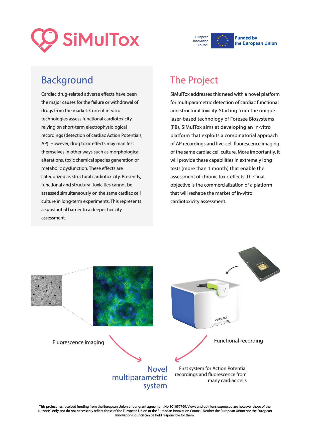 In the context of improving in vitro methods for accurate cardiotoxicity prediction, Foresee Biosystems (FB) developed IntraCell, a novel product for the long-term analysis of Action Potentials (APs) from cardiac cells over many weeks, providing information over prolonged treatments with experimental drugs. Going beyond IntraCell, SiMulTox aims at developing a novel tool to simultaneously assess in vitro chronic functional and structural cardiotoxicity on the same biological sample. This new product will enable the multiparametric assessment of drug toxic effects very early in the drug development process, thereby reducing risk of unsuccessful clinical stages. It is very well-known that many chemicals can affect not only the electrical activity of the cardiac tissue, but also other biological features, such as, protein expression and localization, metabolism and subcellular organization. To address the need for more reliable platforms for pre-clinical assessment and safety pharmacology, SiMulTox aims at coupling live-cell fluorescence imaging with FB advanced electrophysiological measurement capabilities. This feature is pivotal in the emerging and continuosly growing market of multiplexed platforms for toxicology, because every medication intended for use in humans must be tested before the earliest clinical trial phase to reduce the risk of future heart damage.
